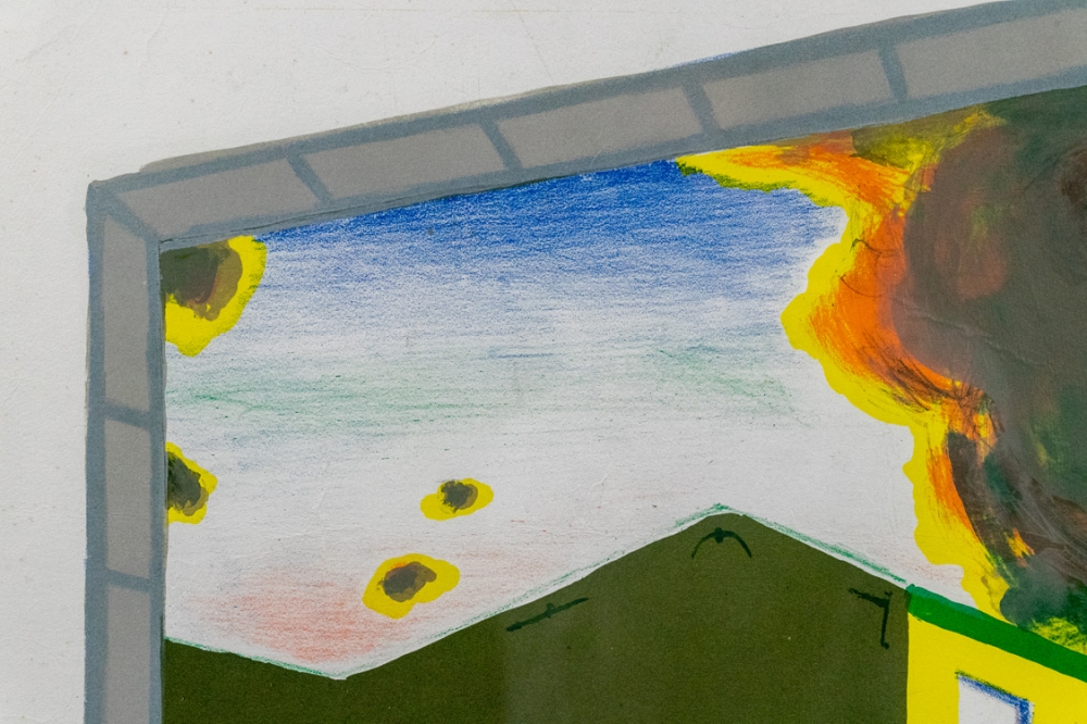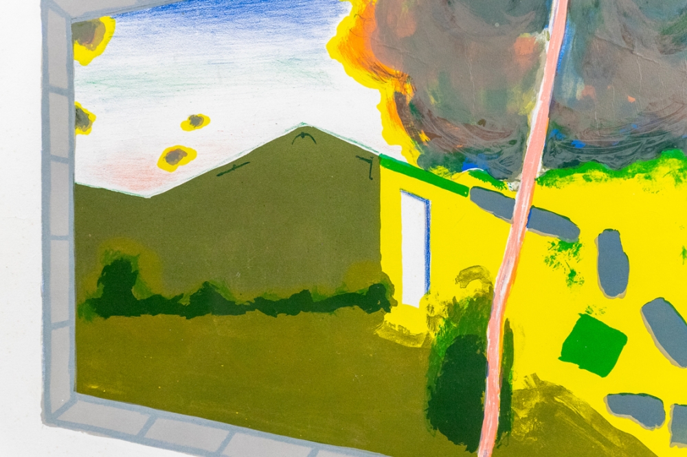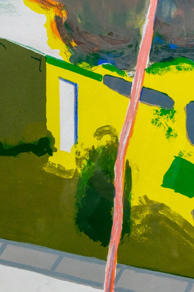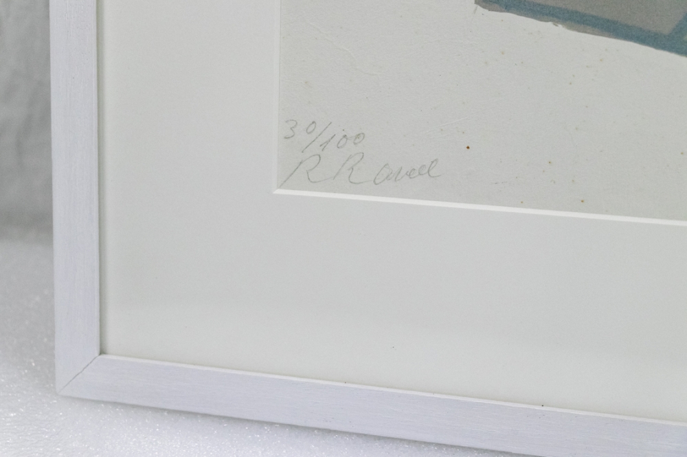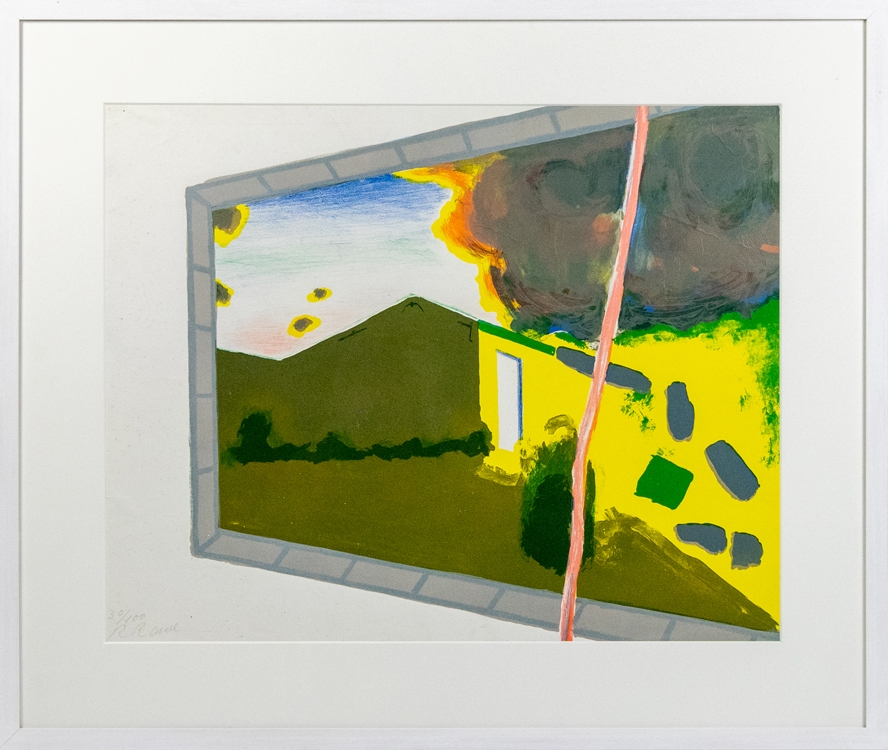 Roger Raveel. Onweder. 1976. Kleurenlithografie: afmetingen 510 x 655 mm. Getekend en genummerd 30/100 in potlood. Er zijn enkele kleine kreukjes in het blad. Het werk is ingekaderd in een mooie witte lijst.