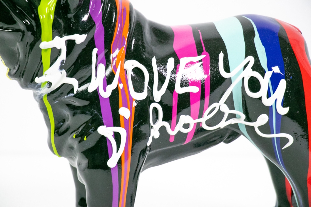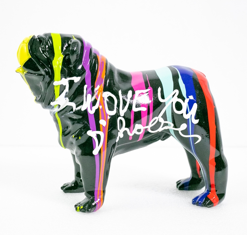 Sculptuur uit kunsthars van Hannes D'Haese in de vorm van een Bulldog en afgewerkt met acrylverf en de spreuk "I wove you". Met de hand gesigneerd door de kunstenaar.