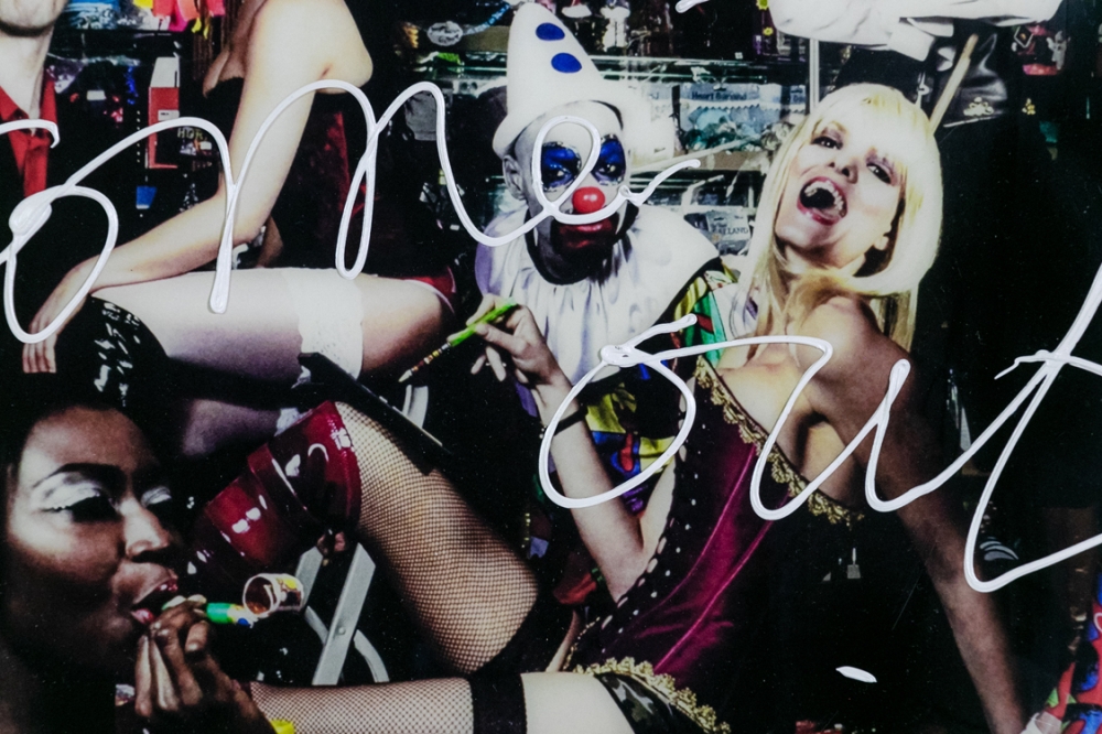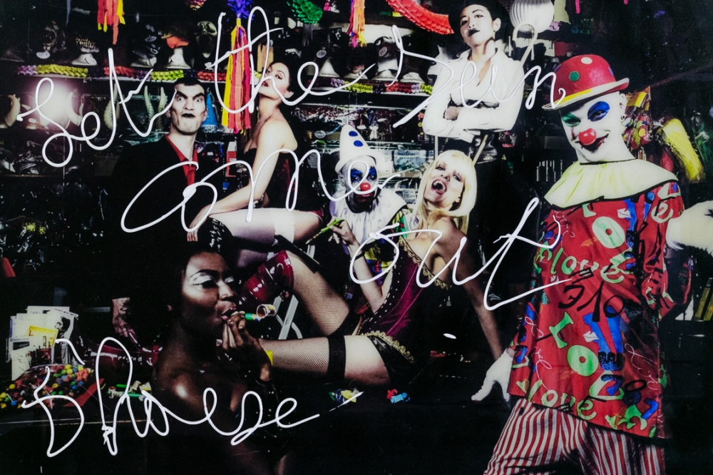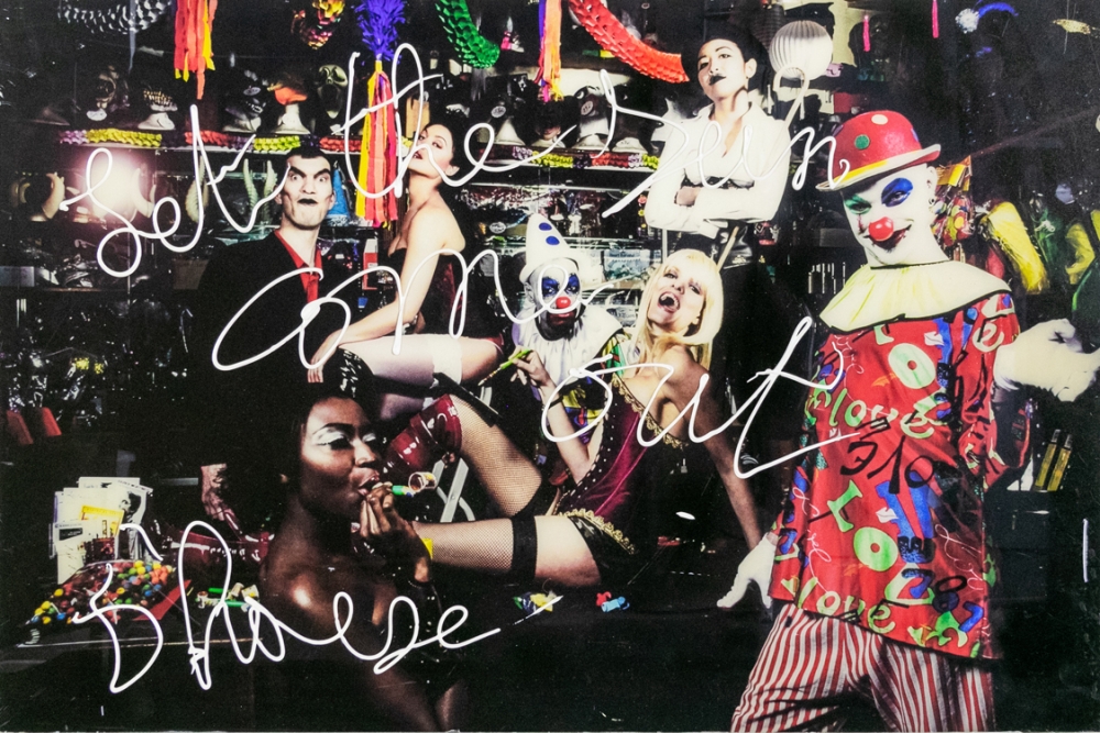 Schilderij met acrylverf op dibond paneel/print van Hannes D'haese. Het werk heeft als opschrift "Let the sun come out".