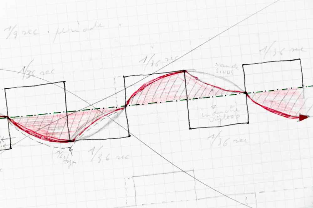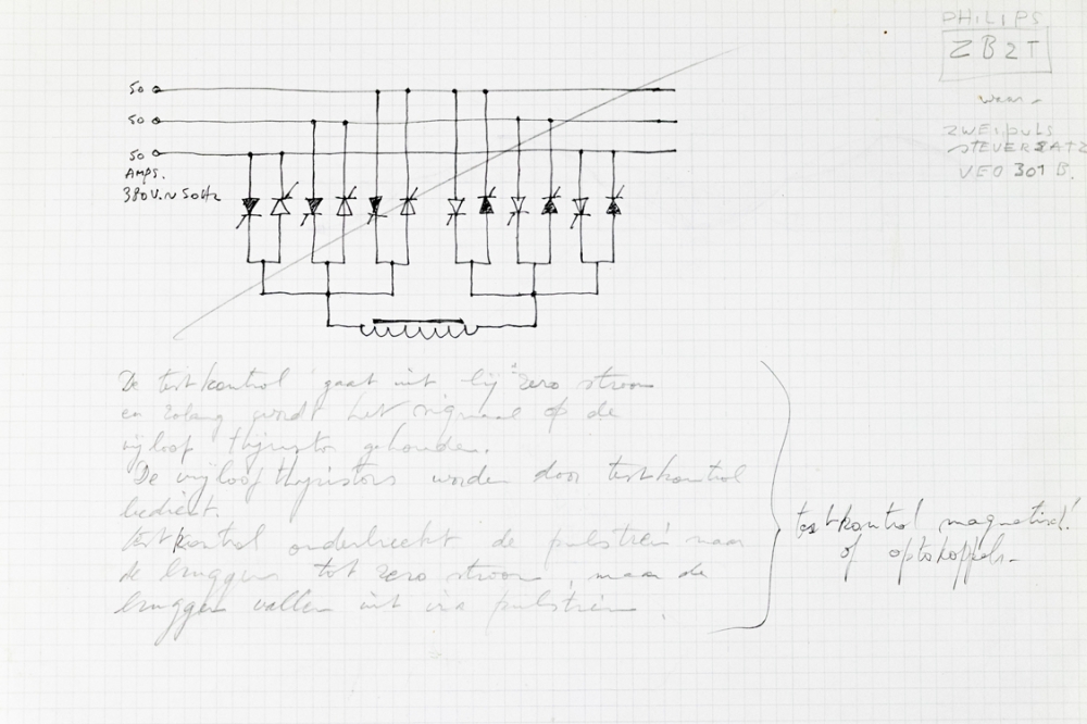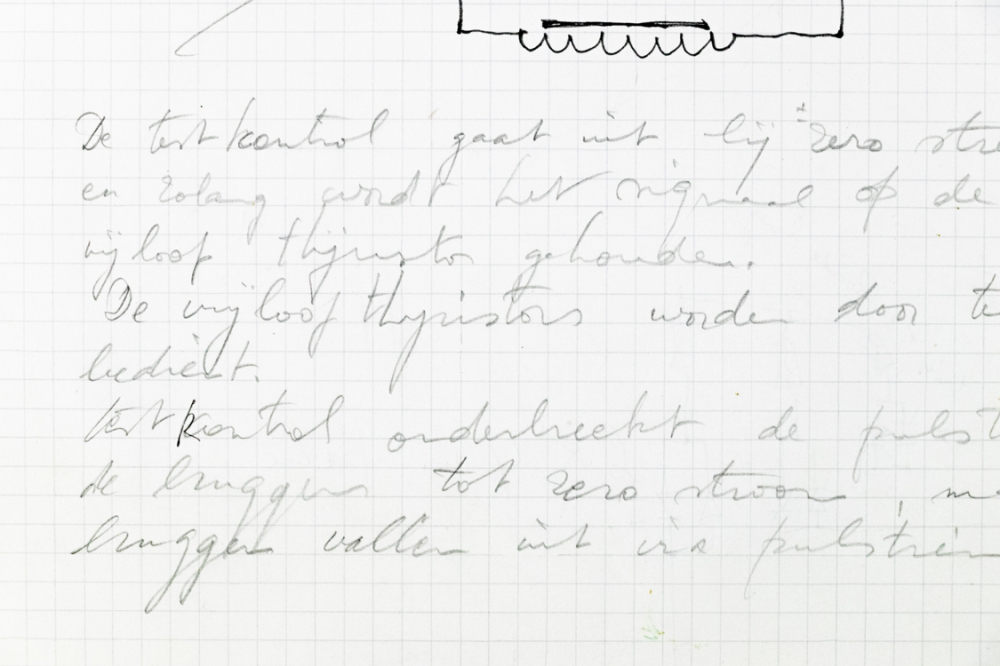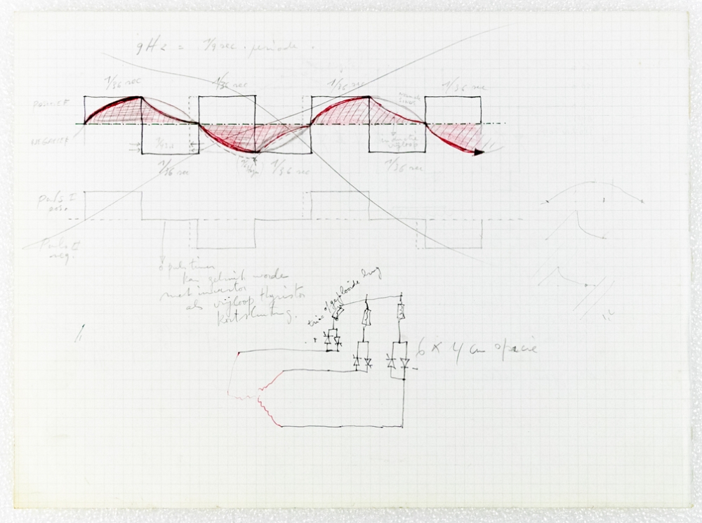Originele, uniek beschreven pagina uit Panamarenko's persoonlijke schetsboek "Hou de tegengestelde polen in evenwicht en lift de machine" uit 1982. Op deze pagina, op beide bladzijden (zie foto 1 en 2), staan zijn berekeningen en bevindingen over de ontwikkeling van zijn magnetische of elektrische werken uit die periode. Deze paginas zijn het stille bewijs dat Panamarenko's werken meer dan alleen creatieve hersenspinsel waren en wel degelijk technisch en wetenschappelijk werden onderbouwd.