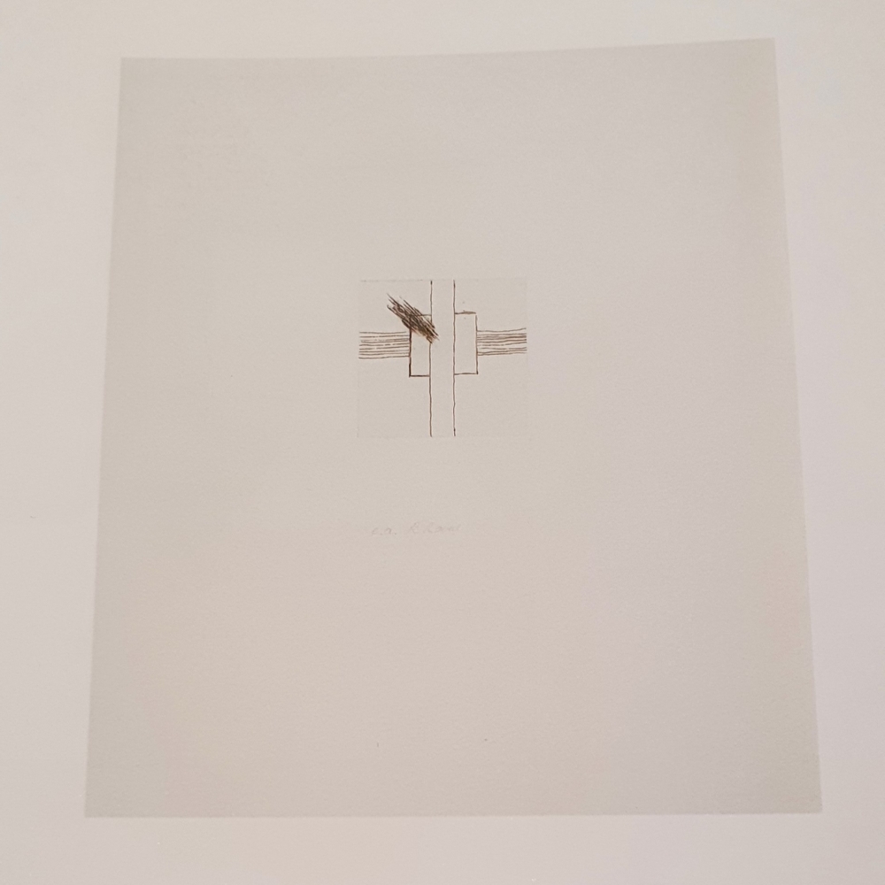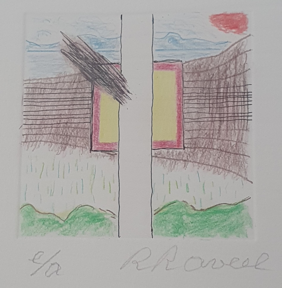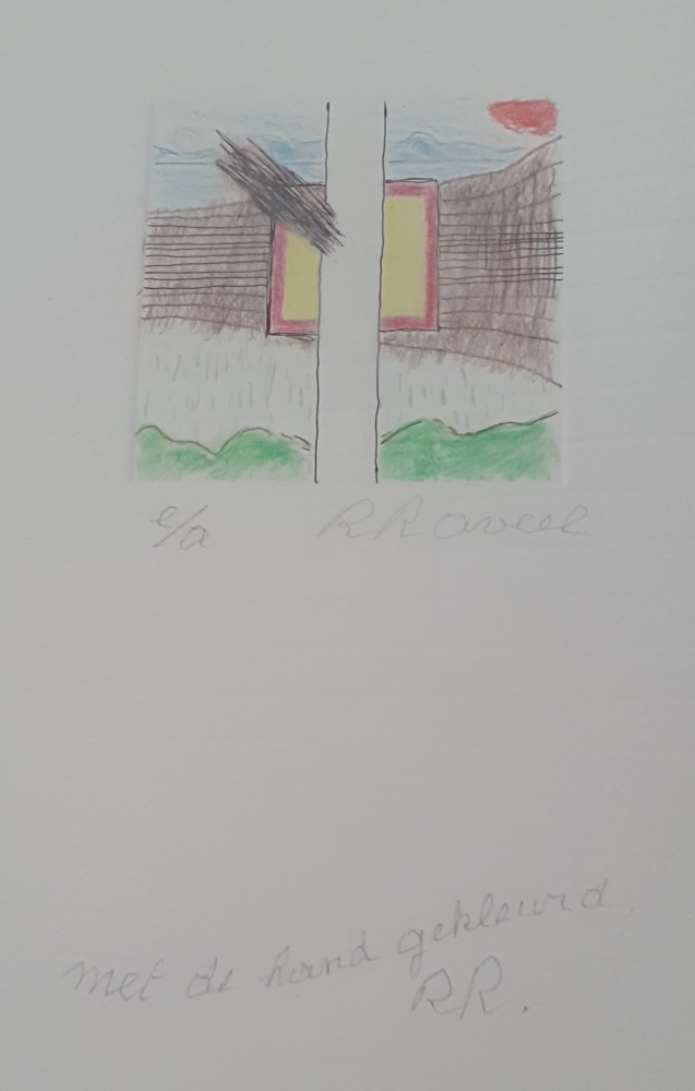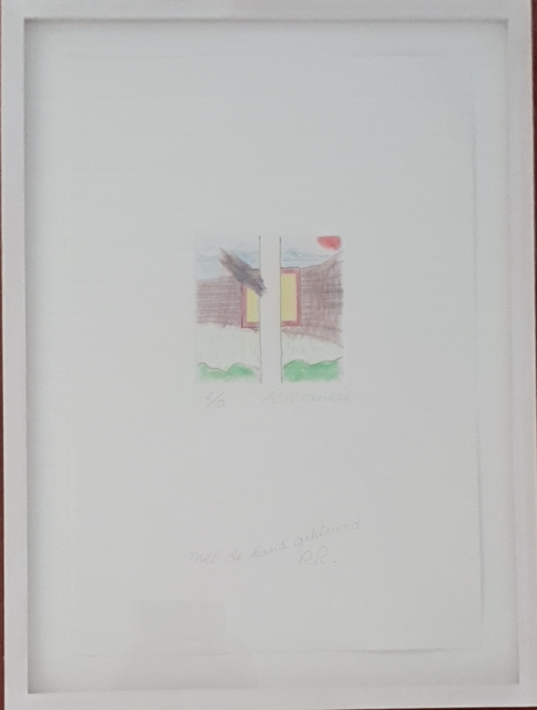 Zwart-wit ets uit 1999. Afmetingen ets: 100 x 100 mm. Afmetingen blad: 390 x 270 mm. De ets werd in 2012 door de kunstenaar met de hand bijgewerkt en ingekleurd, hetgeen dit werk uniek maakt. Het werk is getekend met vermelding 'met de hand gekleurd RR' en 'e/a'. Het betreft één van de drie 'épreuve d'artiste' werken die door de kunstenaar werd bijgewerkt. Zie grafisch oeuvre nr. 228 op pagina 182. De laatste foto is een foto uit het grafisch oeuvre en toont hoe de ets aanvankelijk was. Het werk is ingelijst.