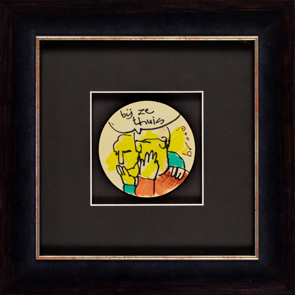 Mooi ingelijst bierviltje, handgetekend en gesigneerd door Herman Brood in zijn gekende stijl. Dit is een uniek kunstwerk en heeft als opschrift "Bij ze thuis". Met bijhorend echtheidscertificaat.
