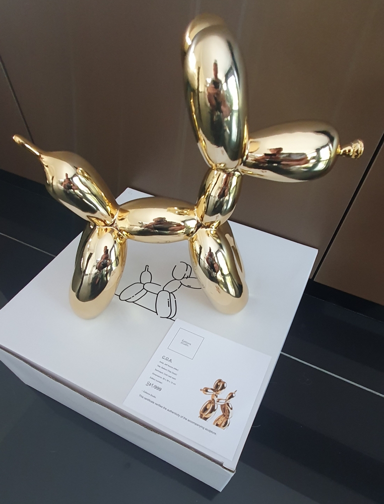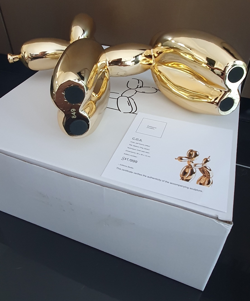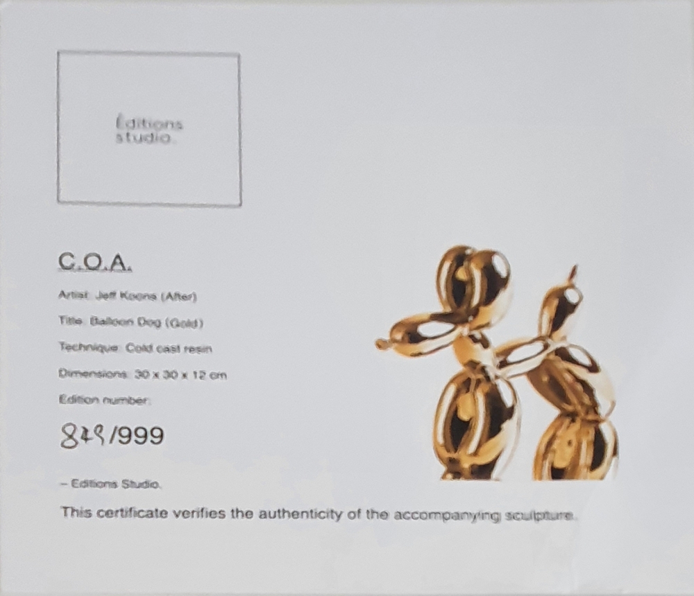Sculptuur in kunsthars naar Jeff Koons, uitgegeven door Éditions Studio. Oplage gelimiteerd tot 999 stuks, waarvan dit nummer 849 is. Het sculptuur komt met de originele verpakking en is vergezeld van het originele certificaat. Sculptuur verkeert in goede tot uitstekende staat.
