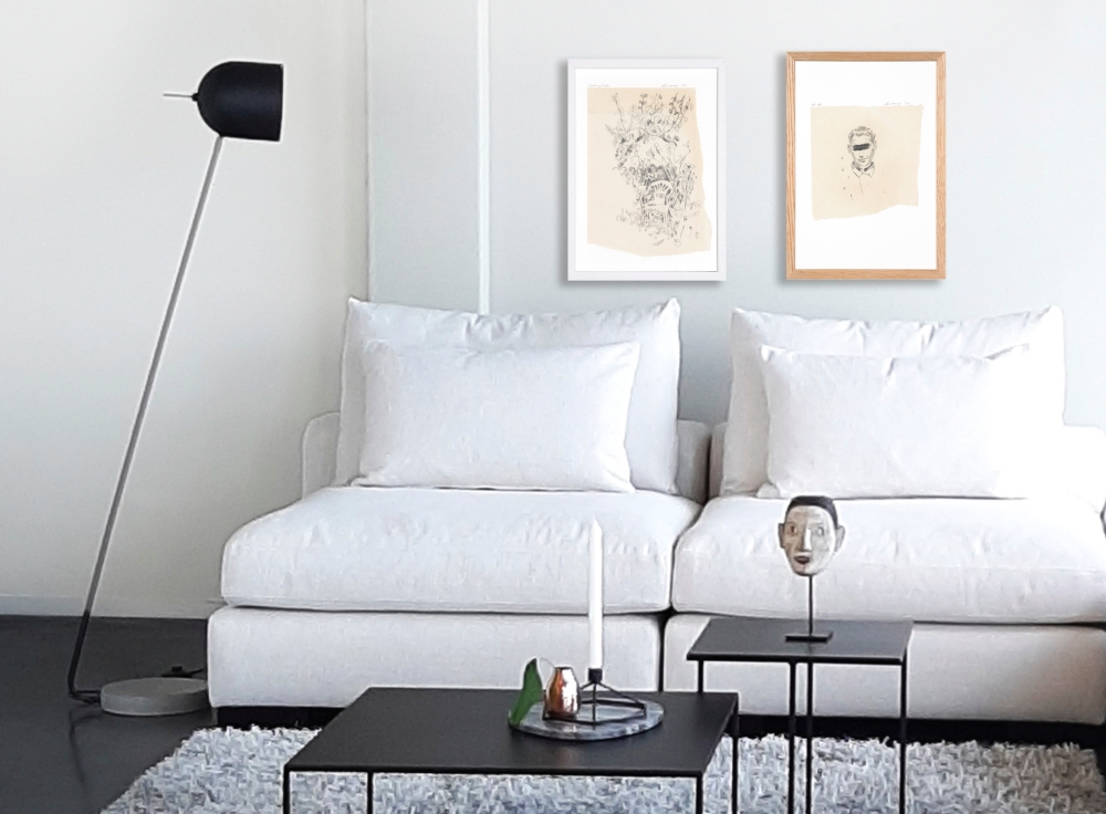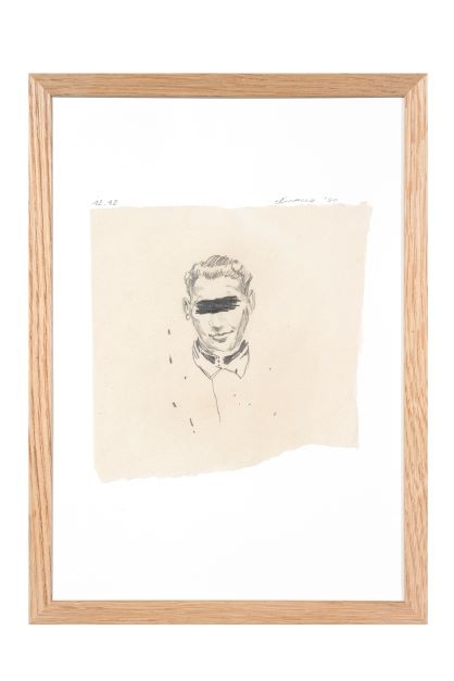 Over de kunstenaar: eline maes (°1991, Kortrijk) woont en werkt in Harelbeke. Naast een vooral digitale job als grafisch vormgever en art director trekt ze zich graag terug in haar atelier om tussen de curiosa en de opgezette dieren de handen vuil te maken met potlood, inkt en verf. Vaak voorkomende thema's zijn nostalgie, portretten, haar thuisstad, vergankelijkheid en de natuur, vaak met een (subtiele) kwinkslag. https://elinemaes.tumblr.com/ Over het werk: 12.42 A4, potlood, 2020 link: Portret van mijn grootvader als krijgsgevangene. Portret van mijn grootvader tijdens zijn gevangenschap in WOII, waar hij niet langer een mens was maar een nummer. Hij is als het ware ont-zield, vandaar de veeg over zijn ogen, zodat zijn gelaat niet langer herkenbaar is, maar hij één van de zovele gevangenen wordt, een nummer zonder eigenheid. (Opmerking 'foto in decor': de schaal van het werk van afwijken van de realiteit.)