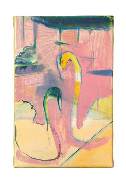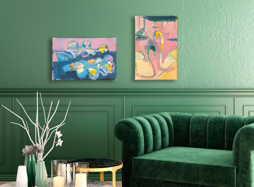 Over de kunstenaar: Katrien Pareit is een gepassioneerd schilder die werkt met atypische kleuren die voor spanning in het werk zorgen. Haar werk toont een sterke gelaagdheid. Haar werken tonen een sterke wisselwerking tussen grafisch en schilderkunstig. Over het werk: Afmetingen 2x 31x20cm voor mij moet er een symbiose zijn tussen natuur en ruimte zowel in de uitvoering als in het thema. Het moet als het ware versmelten. De kleuren zijn bepalend om een fantasiewereld te creëren, een fantasiewereld die ontstaat in mijn hoofd met fauna en flora als vast onderwerp en ruimte als drager. Zo ontstaat er een eigen wereld van vormen en kleuren. (Opmerking:'foto in decor': de schaal van het werk kan afwijken van de realiteit.)