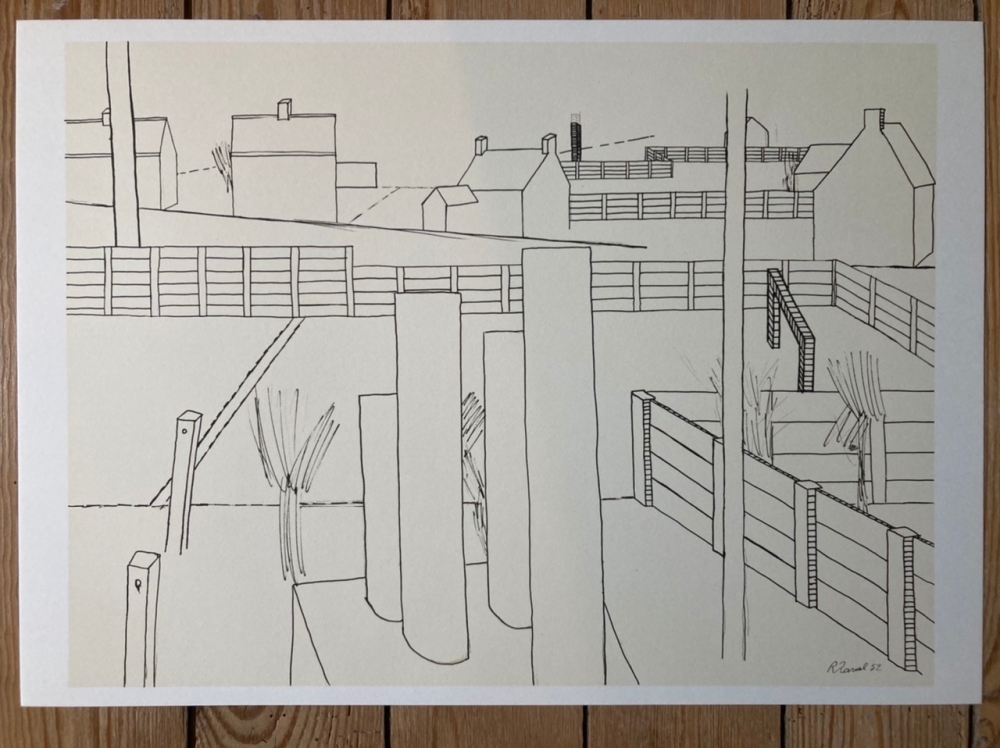 Tekening gedrukt als fotogravure uit de verzamelmap hedendaagse Belgische tekenaars uitgegeven door ibm België en gedrukt door drukkerij laconti. Naar de originele tekening in oost-indische inkt op papier uit 1952