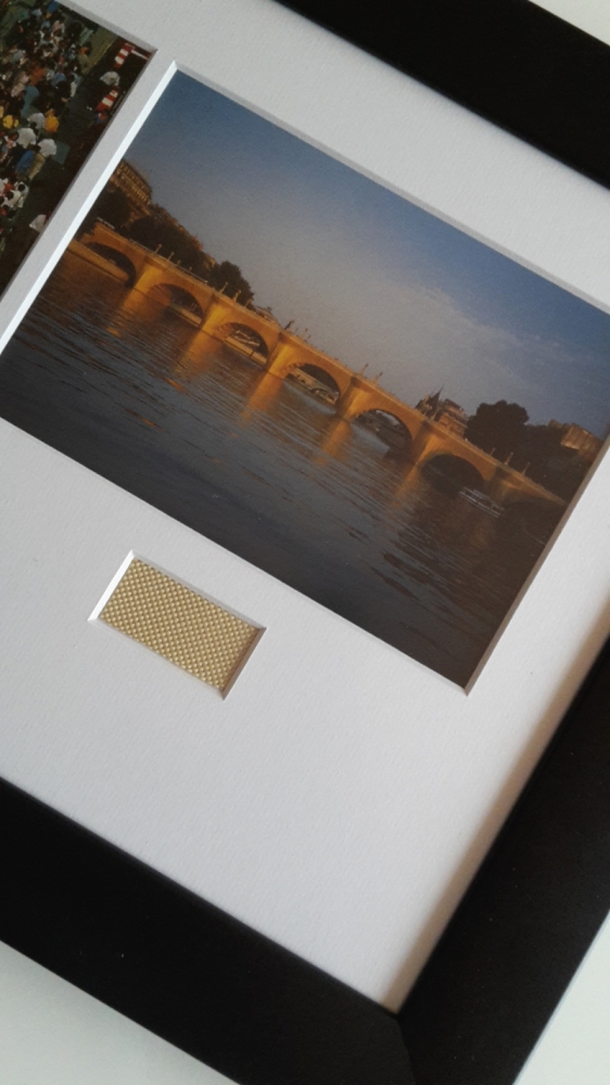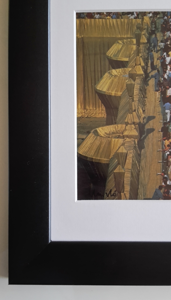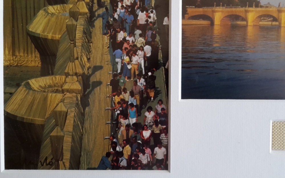 The Pont Neuf Wrapped, Paris, 1975-85 2 artcards waarvan 1 gesigneerd door Christo + origineel stofstuk © Christo 1985; Photo: Wolfgang Volz; © 1995 Taschen Zwart frame met acrylglas 38,5 x 28,5 x 1,8 cm Achteraan afgetapet + zaagtandhangers Uniek stuk.