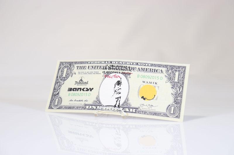 Dollarcanvas van het themapark "Dismaland" van Banksy, dat twee maanden van augustus tot september 2015 werd gehouden. Artiest: Banksy x Dismaland Titel: Somber Dollar Canvas 2015 zeefdruk dollarbiljet Beperkte editie 10,5 x 5,5 cm Komt niet ingelijst Geleverd vanuit FRANKRIJK met trackingnummer en verzekering