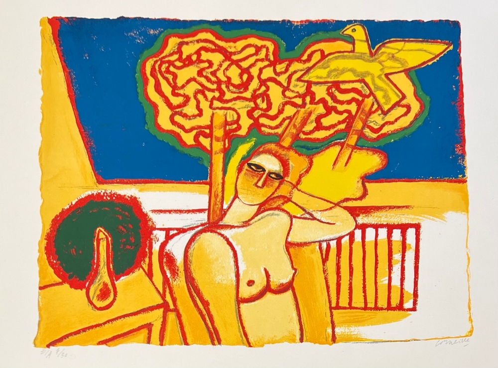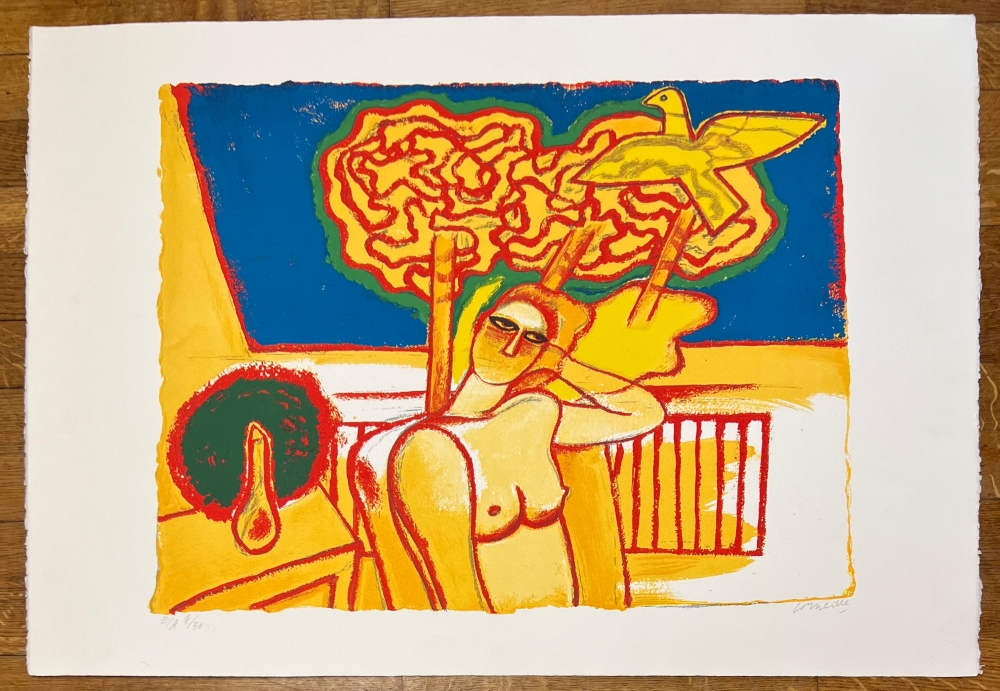 Jeune Femme à la fenêtre Très belle lithographie aux couleurs chatoyantes et ensoleillées. Dans le sillage de Gauguin et Matisse, Guillaume Corneille crée un monde jovial qui célèbre l'harmonie avec la nature. La qualité de la plaque lithographique est telle que Corneille donne l'illusion au spectateur d'avoir les touches de pinceaux en face de soi. Dans ses presque 70 ans de carrière, Corneille a régulièrement fait référence à Matisse. Ici Corneille rend hommage à Matisse, par le sujet, par les couleurs, et par la nature morte sur la table devant, dont le plan bascule dans le plan de l'image. Lithographie originale du peintre Guillaume Corneille (1922-2010), né à Liège de parents Néerlandais, membre fondateur du mouvement Cobra avec Karel Appel, Asger Jorn, Constant, Dotremont, Lucebert, ou encore Alechinsky. Signée au crayon en bas de la main de l'artiste - Numérotée E/A 7/30 (épreuve d'artiste). Tampon Atelier Corneille au dos Dimensions totales : 63 x 91 cm - Très bon état - Envoi sécurisé avec assurances par UPS