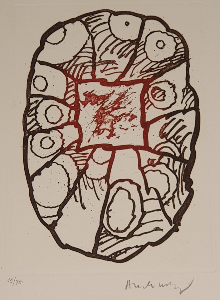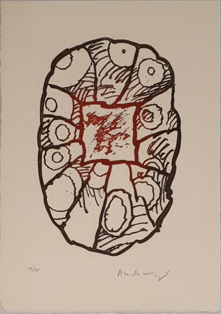 Mooie kleurenets van de Belgische kunstenaar Pierre Alechinsky. Het werk is gemaakt op geschept papier. Het is gesigneerd en genummerd 19/75. Het werk dateert uit 1975 en verkeert in goede staat. Het werk is niet ingelijst.