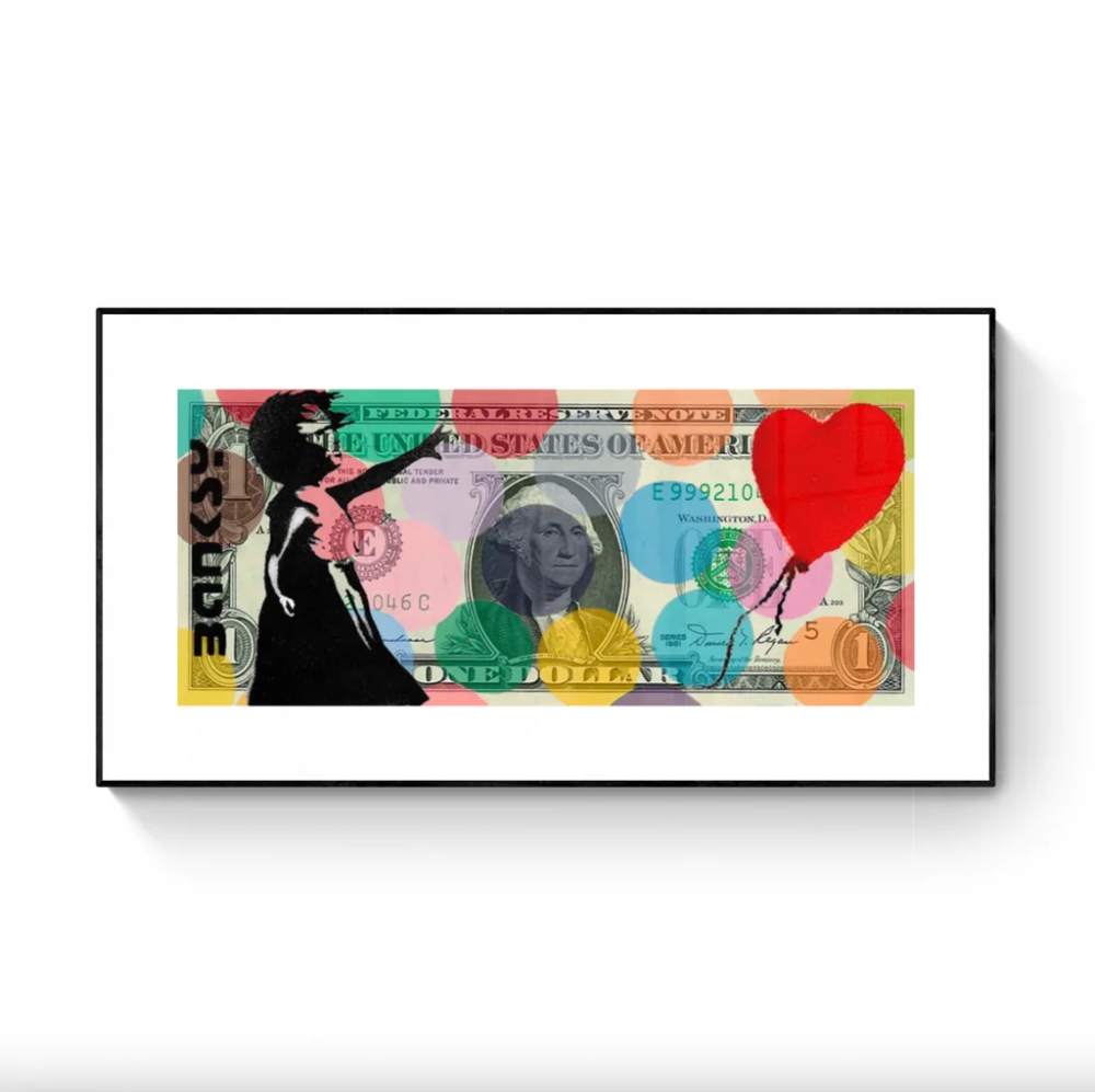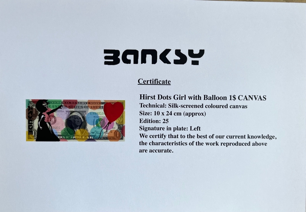 Banksy est un des artistes street art les plus cotés au monde BANKSY Hirst Dots Haring Dog 1$ CANVAS Technical: Original silk-screen canvas Signature: Left Size: 10 x 24 cm (approx) Edition: 25 Comes with COA Unframed