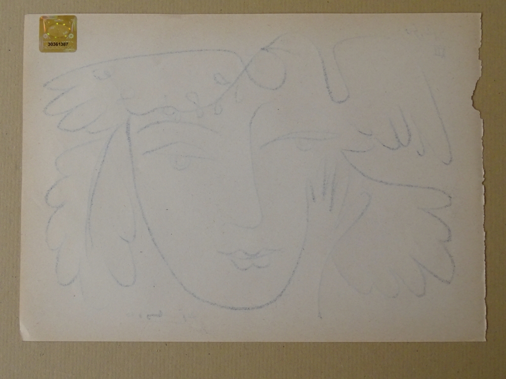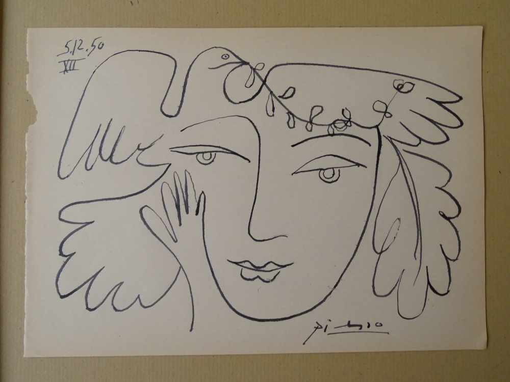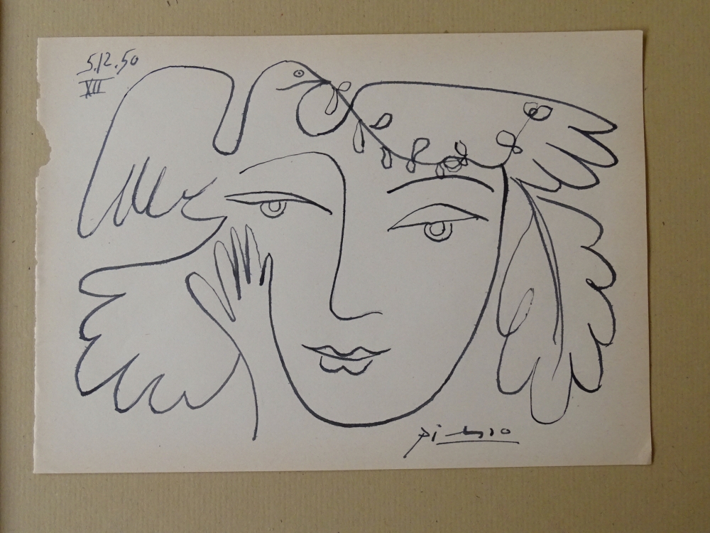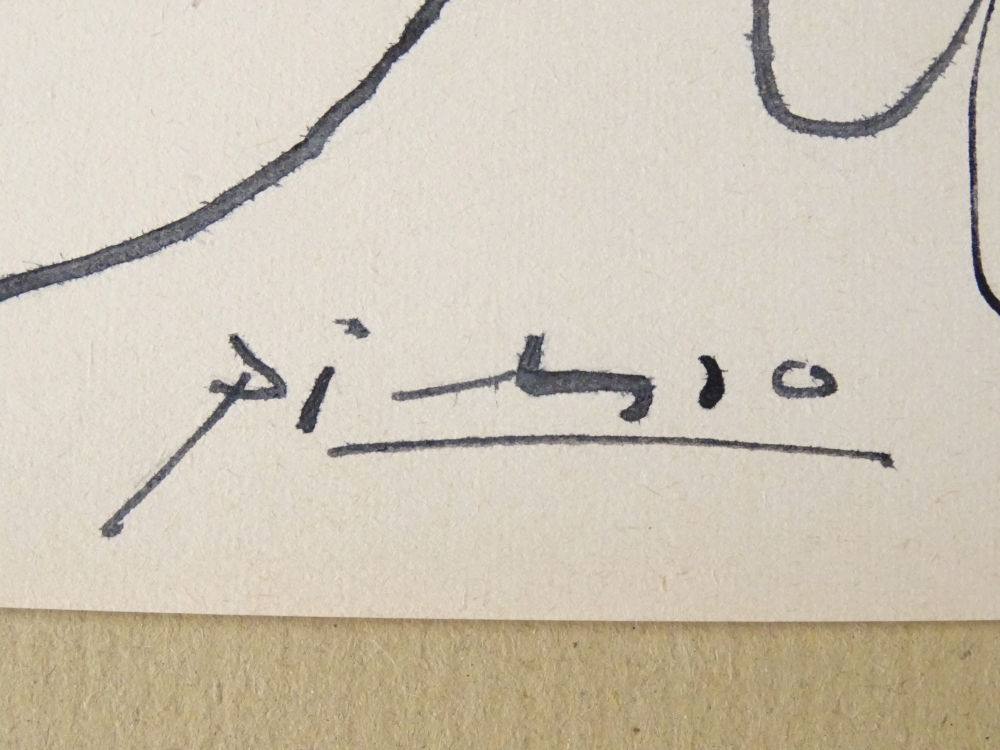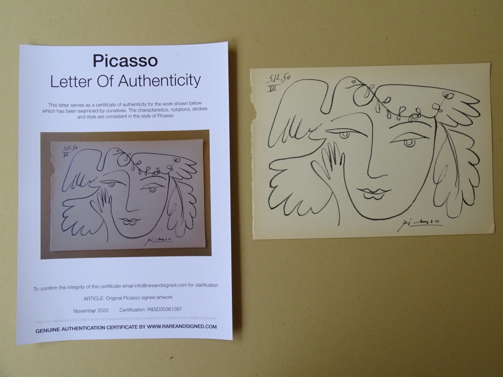 Pablo Picasso (attributed) ink drawing Very good condition Letter of authenticity includedPablo Ruiz Picasso[a][b] (25 October 1881 8 April 1973) was a Spanish painter, sculptor, printmaker, ceramicist and theatre designer who spent most of his adult life in France. Regarded as one of the most influential artists of the 20th century, he is known for co-founding the Cubist movement, the invention of constructed sculpture, the co-invention of collage, and for the wide variety of styles that he helped develop and explore. Among his most famous works are the proto-Cubist Les Demoiselles d'Avignon (1907), and the anti-war painting Guernica (1937), a dramatic portrayal of the bombing of Guernica by German and Italian air forces during the Spanish Civil War.