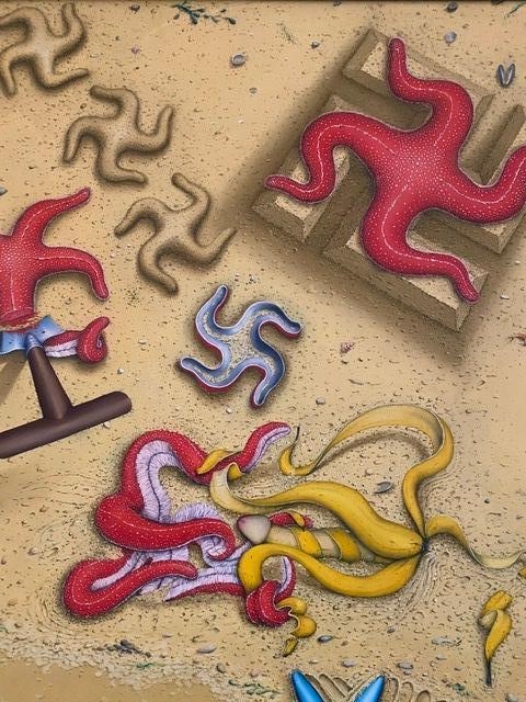 Prachtig groot olieverfschilderij op paneel Mooi kleurenpalet. Gedurfde composities, typisch voor deze bekende kunstenaar. Complementaire kleuren, b.v. gele bananenschil t.o.v. blauwe opwindbare speelgoedster. Uniek werk! Zeker voor deze grote! De kader is niet in de beste staat maar het werk kan zo aan de muur. Het werk zelf is in prachtige staat