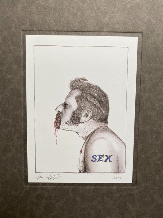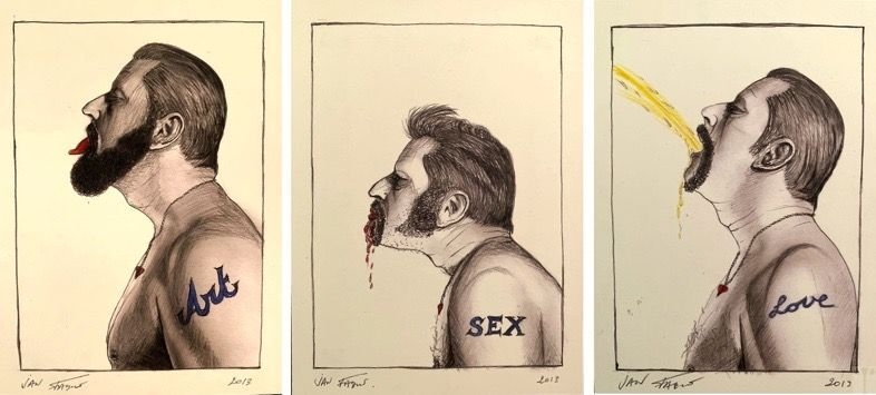 Jan Fabre - ART SEX LOVE- Litho & Collage - 2013 - Handgesigneerd 3x collage print op dik museumboard 3 Litho's: zelfportret gemaakt met potlood en blauwe balpen, genaamd 'ART', 'SEX' & 'LOVE' Alle 3 handgesigneerd in potlood linksonder Gedateerd in potlood rechtsonder: 2013 Op verso genummerd in potlood: 10/75 Litho: 17.1x12.6 cm Board: 50x35cm De werken zitten in een prachtige witte glanzende map, met in daarop in reliëf de naam van de kunstenaar. Nooit ingekaderd, steeds in map bewaard.