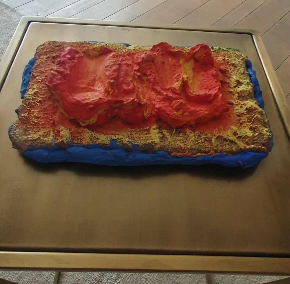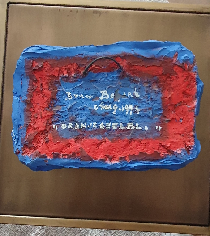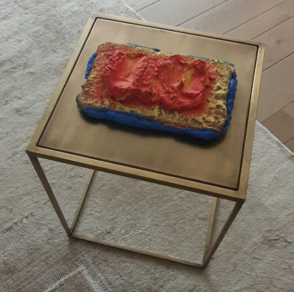 Zeer mooi materiewerk van de Belgische kunstenaar Bram Bogart. Het werk is gesigneerd en gedateerd op de zijkant. Het is tevens gesigneerd, gedateerd 'aug. 1994' en getiteld 'oranjegeel' op de achterkant.