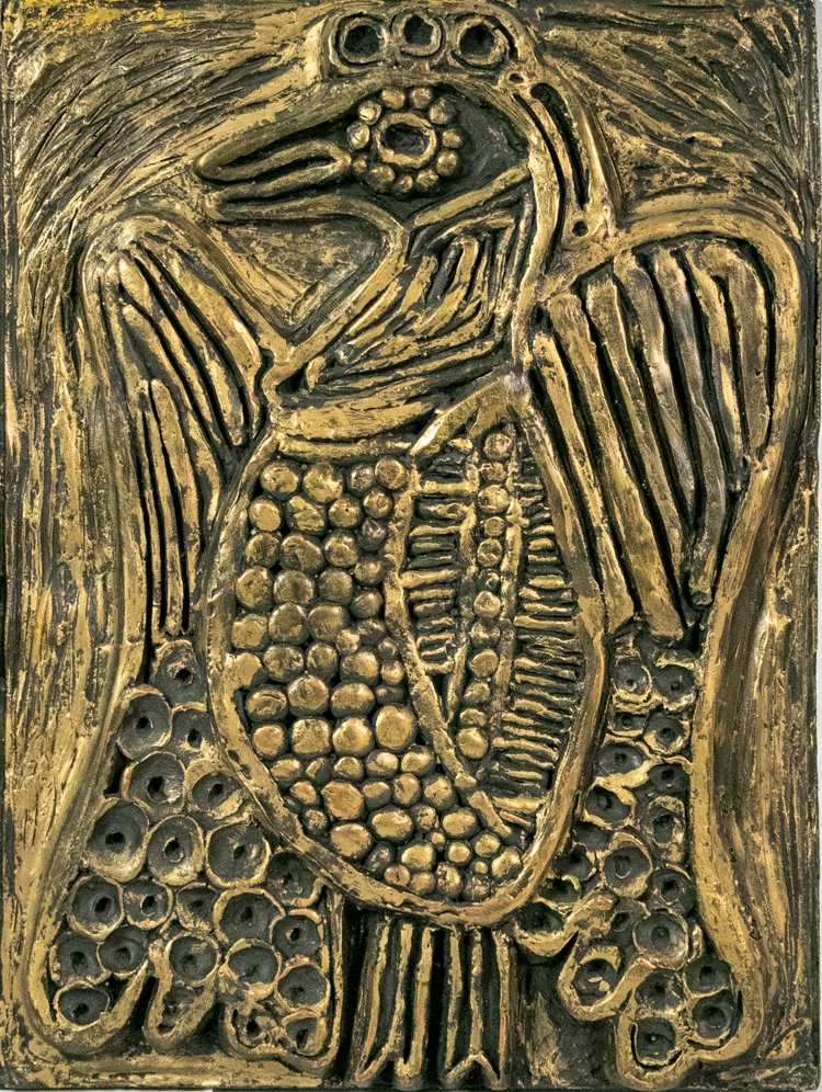 Bas relief in composiet of kunsthars, gemaakt met een bronskleurige uitstraling. Onderaan gesigneerd in het werk, zie laatste foto.