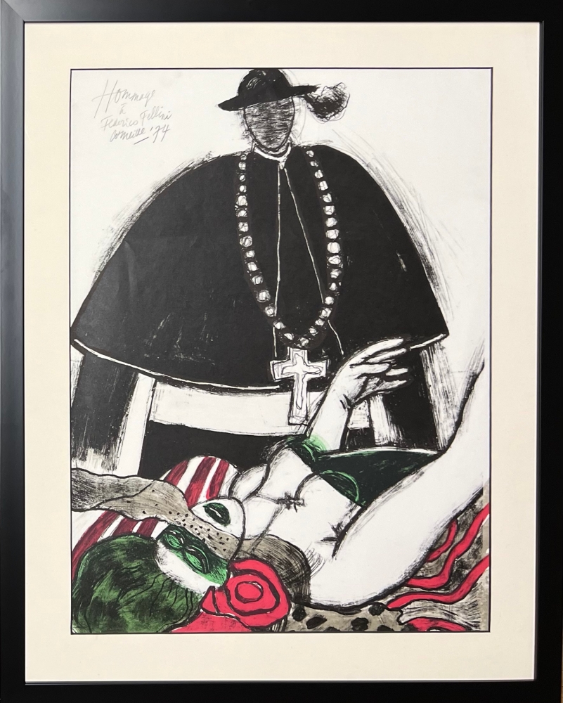 Belle oeuvre encadrée avec Tampon Atelier Corneille au dos. Nous célébrons cette année les 100 Ans de la Naissance du peintre !(Rétrospective Corneille jusqu'au 15 Janvier au Cobra Museum de Amstelveen). Exemplaire unique (tirage intermédiaire) titré, signé et daté au graphite en haut à gauche, délivrée avec un certificat d'authenticité. Epreuve d'essai provenant de l'Atelier Guillaume Corneille. Lithographie en couleurs sur Arches, Atelier des presses à bras Michel Cassé, Paris, 68 x 50 cm. 83 x 66 cm avec cadre. Un tirage commercial avec des couleurs différentes a été imprimé à 100 exemplaires. Oeuvre référencée dans le catalogue raisonné Donkersloot sous le numéro 361. Guillaume Corneille rend hommage à son ami Federico Fellini avec lequel il faisait des promenades dans la banlieue de Rome. Très bon état - Envoi sécurisé avec assurances par UPS