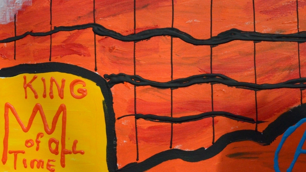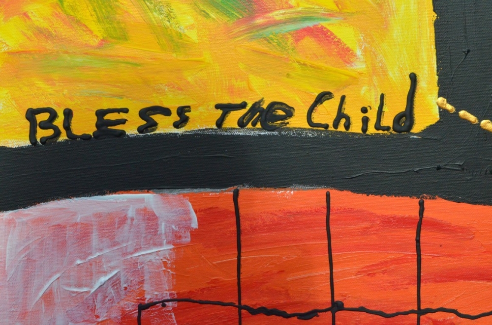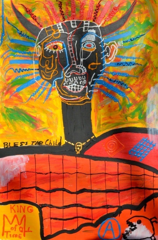 ,,BRONCO , KING in TIME , een kleurrijk werk,ook wel genoemd ; BLESS the CHILD ,het werk is stevig in het verf gezet , en geeft duidelijk de connectie aan tussen BASQIAT en ANDY WARHOL "en BRONCO aan