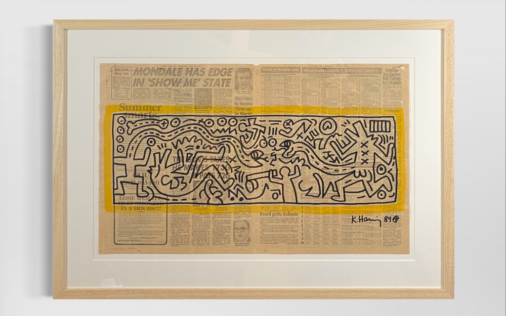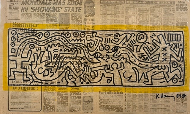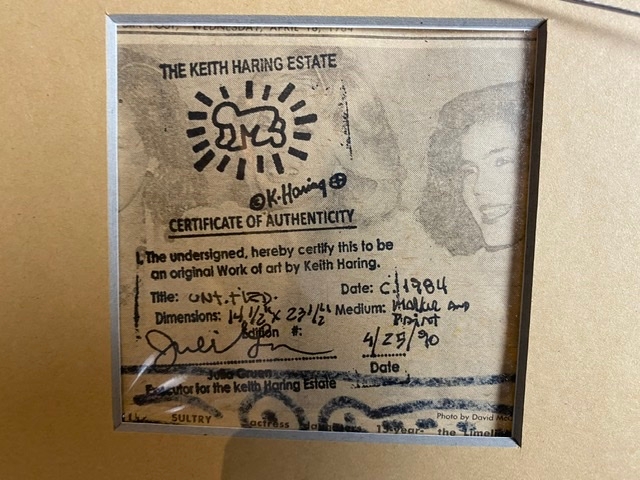 Originele tekening op krant door Amerikaanse pop art kunstenaar Keith Haring. Gesigneerd en gedateerd. Met certificaat stempel door de foundation op de achterzijde. Verzekerde verzending alsook ophalen mogelijk.