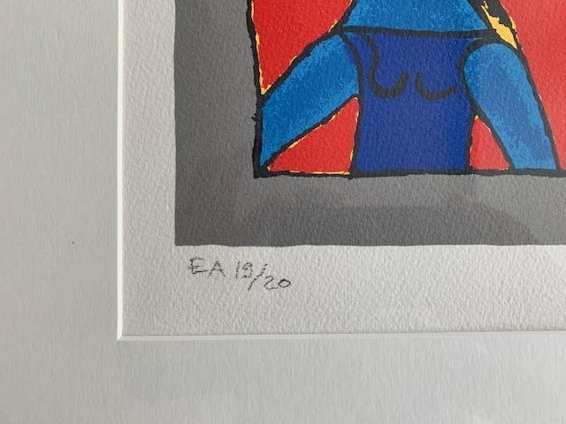 Zeefdruk van Guillaume Corneille getekend en genummerd in potlood. Het werk is een proefdruk gemarkeerd als EA. Dit is EA 19/20. Het werk is in zeer goede staat. Het is ingelijst met alu lijst, plexi en passe partout.