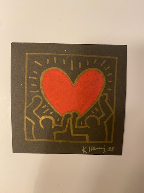 Prachtig origineel werk van Keith Haring. Op kartonnen papier. Gesigneerd met een gouden stift en rood gekleurd hart. Het werk meet 12,5 bij 12,5 en is op de voorzijde gesigneerd en gedateerd. 1988 Perfecte staat.