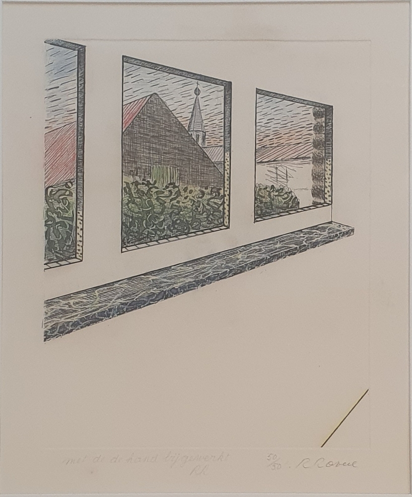 Zeer mooie zwart-wit ets van de Belgische kunstenaar Roger Raveel. Het werk werd gemaakt op 50 exemplaren. Slechts enkele exemplaren werden met de hand ingekleurd. Het aangeboden werk is er een van hetgeen dit werk uniek maakt. Het werk verkeert in goede staat. Het werk is ingelijst met passe-partout. Het werk wordt beschreven in het grafisch oeuvre nr. 32C.4 op pagina 61.