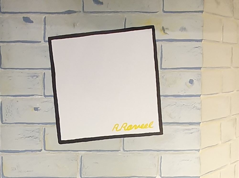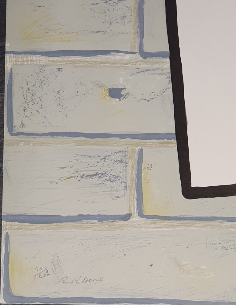 Zeer leuke kleurenzinkografie van de Belgische kunstenaar Roger Raveel. Het werk is zeer typisch met afbeelding van een muurtje en het gekende vierkant. Het werk bevat een geel gedrukte handtekening in het witte vierkant. Het werk is tevens gesigneerd en genummerd met potlood 46/200 links onder. Het werk wordt beschreven in het grafische oeuvre onder nummer 37 op pagina 64.