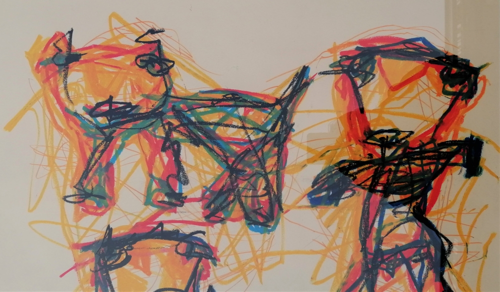 Karel APPEL (1921 -2006) Krijt tekening op papier; van Drie figuren afmetingen 45 x 63 cm, Afmetingen met passe-partout zwarte lijst. ca. 65 x 83 cm Gesigneerd met datum 1976 midden onderaan de tekening
