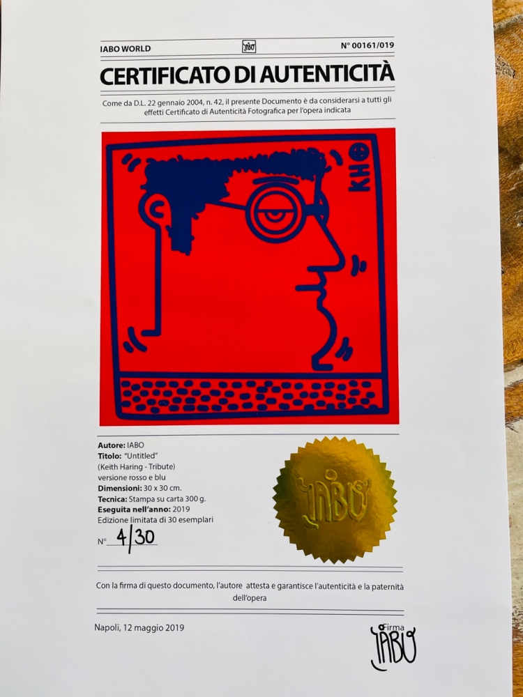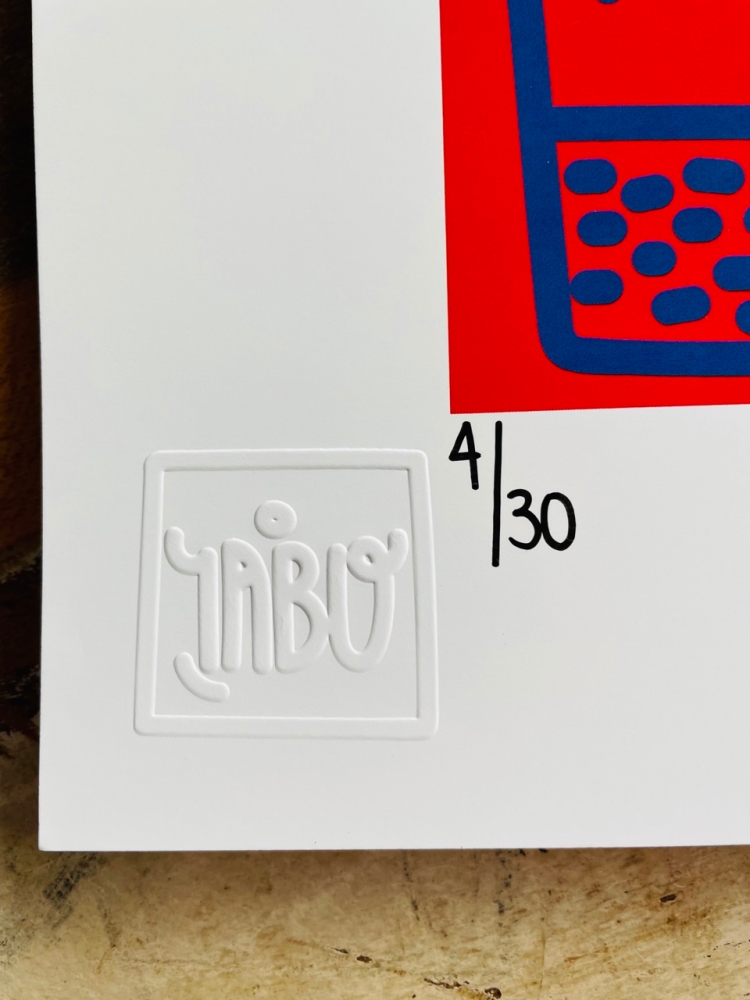 Offsetdruk uit 2019 op 300g Fedrigoni papier. Beperkte oplage van 30 exemplaren waarvan dit nummer 4 is. Gestempeld, genummerd en handgesigneerd door de kunstenaar met certificaat van echtheid (COA). Op het eerste gezicht is IABO (Napels, 1980) geïnspireerd door de popart uit de jaren 80. Hij onderzoekt de lijn en bestudeert de vorm ervan. En hij maakt er een echte obsessie van, een constante zoektocht naar mechanische perfectie, maar op een ambachtelijke manier. Bij IABO is de grens tussen mens en machine erg dun. Zijn creaties zijn technisch perfect. Een obsessie die hem ertoe heeft gebracht te experimenteren en een zeer persoonlijke taal te samen te stellen.