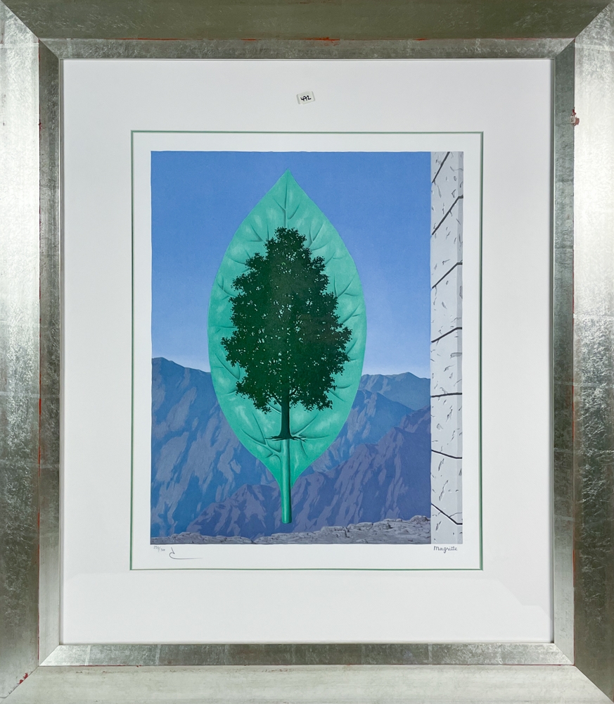 Zeer mooie en kleurrijke kleurenlithografie (2003) naar het origineel werk van Magritte 'La folie des grandeurs II' uit 1948 uitgebracht door het atelier van Philippe Moreno met toelating en onder controle van het ADAGP die de nalatenschap van René Magritte vertegenwoordigd. De handtekening van Magritte is gedrukt. Het werk is geparagrafeerd door Charly Herscovici, vertegenwoordiger van de nalatenschap Magritte. Het werk is genummerd 254/300 en bevat tevens droogstempels van de uitgever ADAGP en de nalatenschap Magritte. Het werk is mooi ingelijst en verkeert in zeer goede staat.