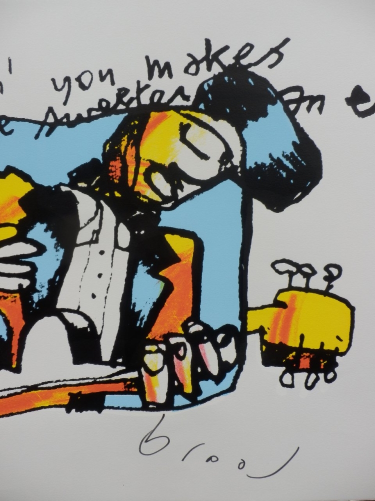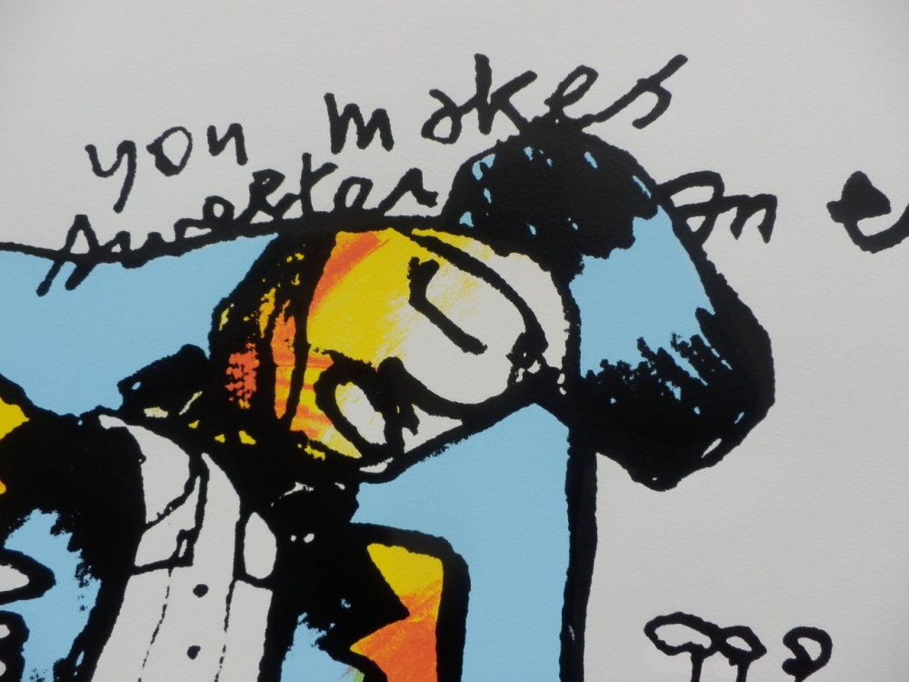 Prachtige grote en uiterst zeldzame kleurenzeefdruk van Herman Brood. De volledige titel is : Lovin You Makes My Life Sweeter Than Ever. Afmeting blad 75 x 55 cm in nieuwstaat. Wordt geleverd met echtheidscertificaat en een foto waarop Herman deze werken signeert,