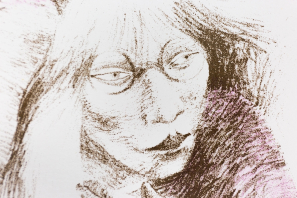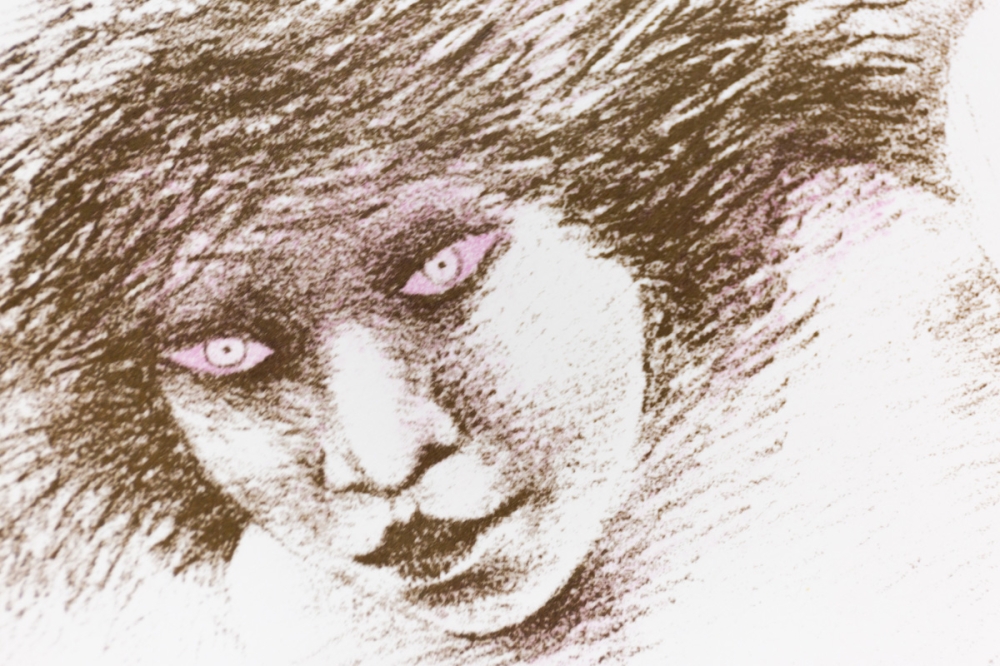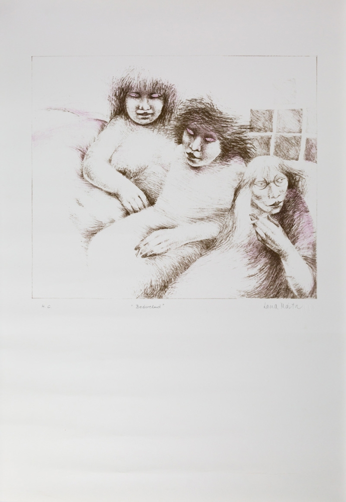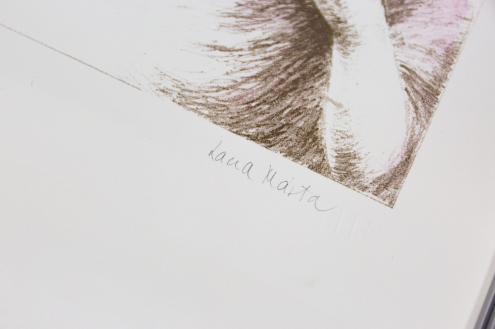 Kleurlitho van Marta Lacza : Bedwelmd. Oplage = H.C. In originele staat (niet ingekaderd). Vervaardigd in het Rijkscentrum voor Grafiek "Frans Masereel" te Kasterlee. Marta Lacza nam regelmatig deel aan tentoonstellingen in Hongarije en in het buitenland.