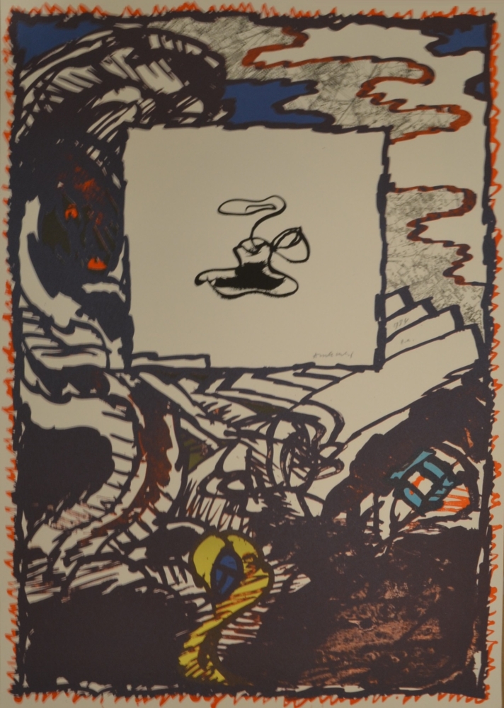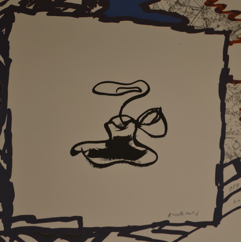 Encrier de voyage Originele kleurenlitho, 1984. In dit werk (vanuit een open inktfles ), ontstaat een werveling van inkt als een geest uit de lamp van Aladdin en de kaart achter het witte vierkant (een blanco vel papier?) Afbeeldingsgrootte: 725x518 mm Handgetekend in potlood als 'EA' (Epreuve dArtiste)
