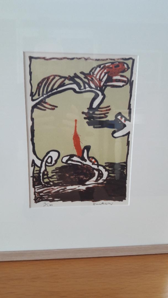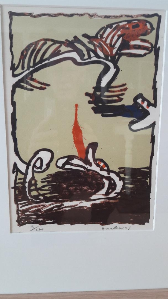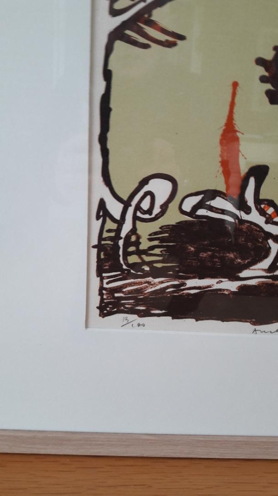 Speciaal werk van de belgische kunstenaar Pierre Alechinsky, 40x50 cm., op 100 ex., titel "le tireur de langue", in een nieuwe, stevige houten kader. Het werk is met potlood ondertekend en het verkeert in uitstekende staat.