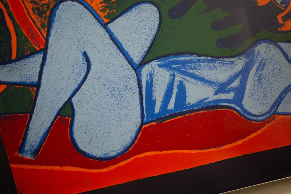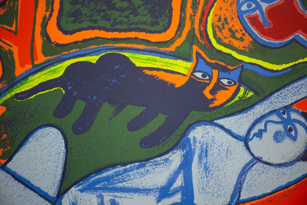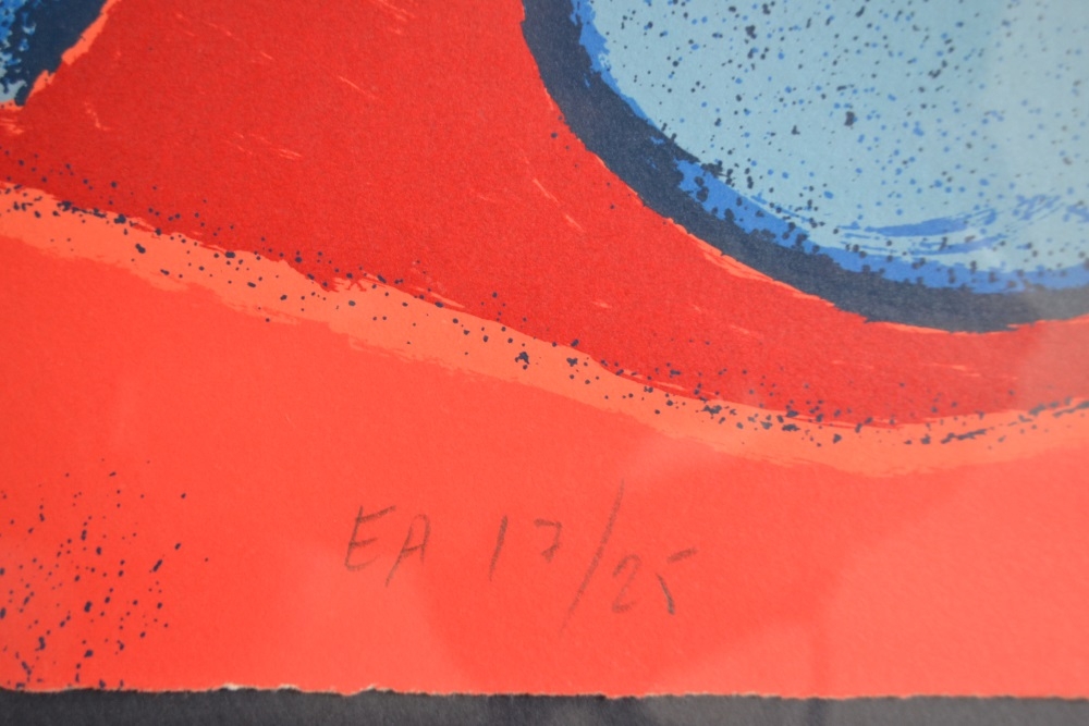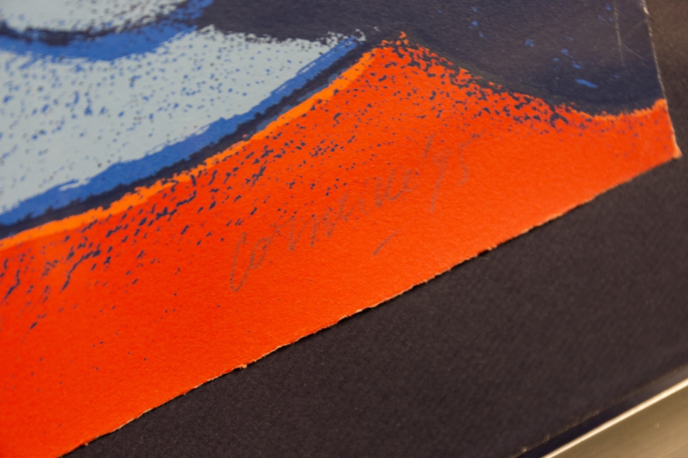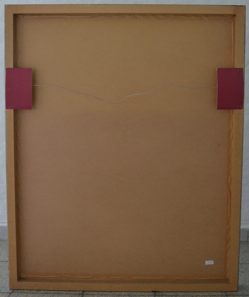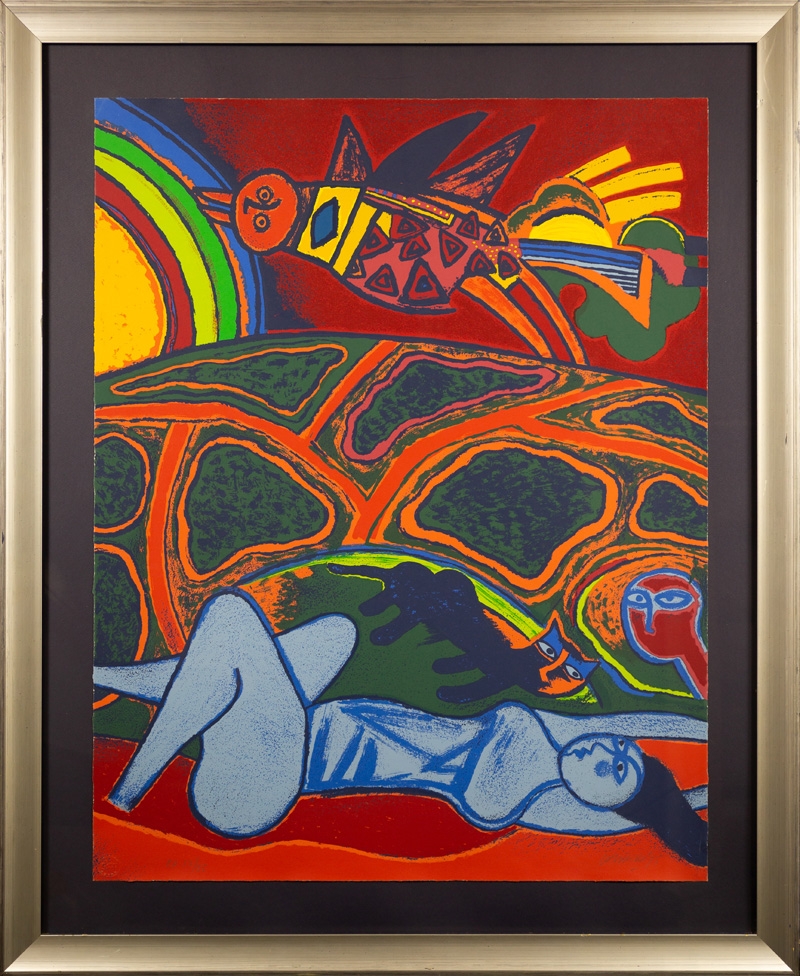 Titel: Grande terre à larc-en-ciel Jaartal: 1995 Afmetingen blad: 96 cm x 75,5 cm Afmetingen kader :120 cm x 98 cm x 5 cm Oplage: E/A 7/25 Gesigneerd: Ja, handgeschreven met potlood (rechtsonder) Materiaal: Zeefdruk op geschept papier Het werk is professioneel ingekaderd met een donker paarse gekleurde achtergrond. De Houten kader met zilveren beslag en zwarte rand meet 120 cm x 98 cm x 5 cm dik Achteraan is een stevige ophang voorzien.