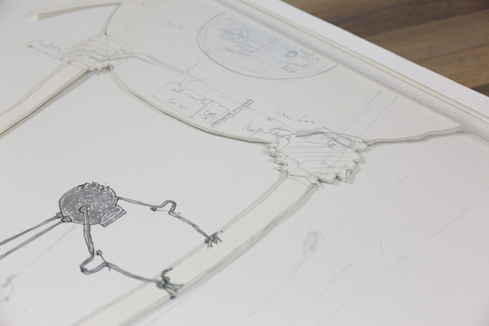 Collage van Panamarenko, met als basis een litho die deels met de hand is ingekleurd. Sommige stukken van de arlikoop zijn verhoogd gemonteerd en het werk bevindt zich in een nieuwe, ongebruikte plexibox.