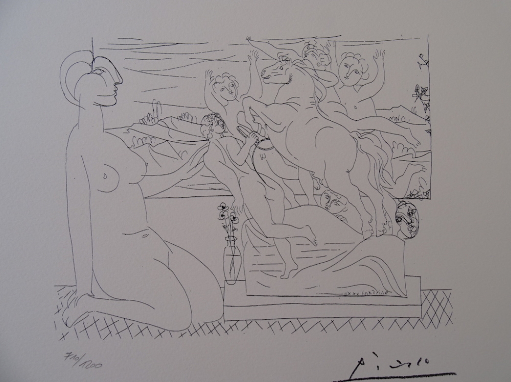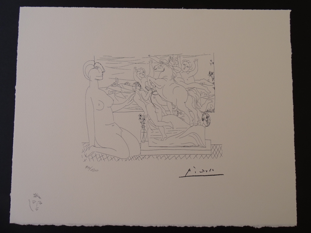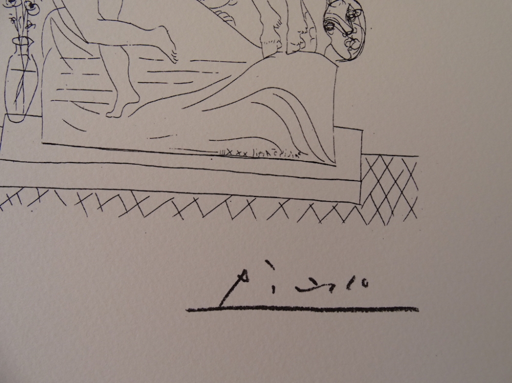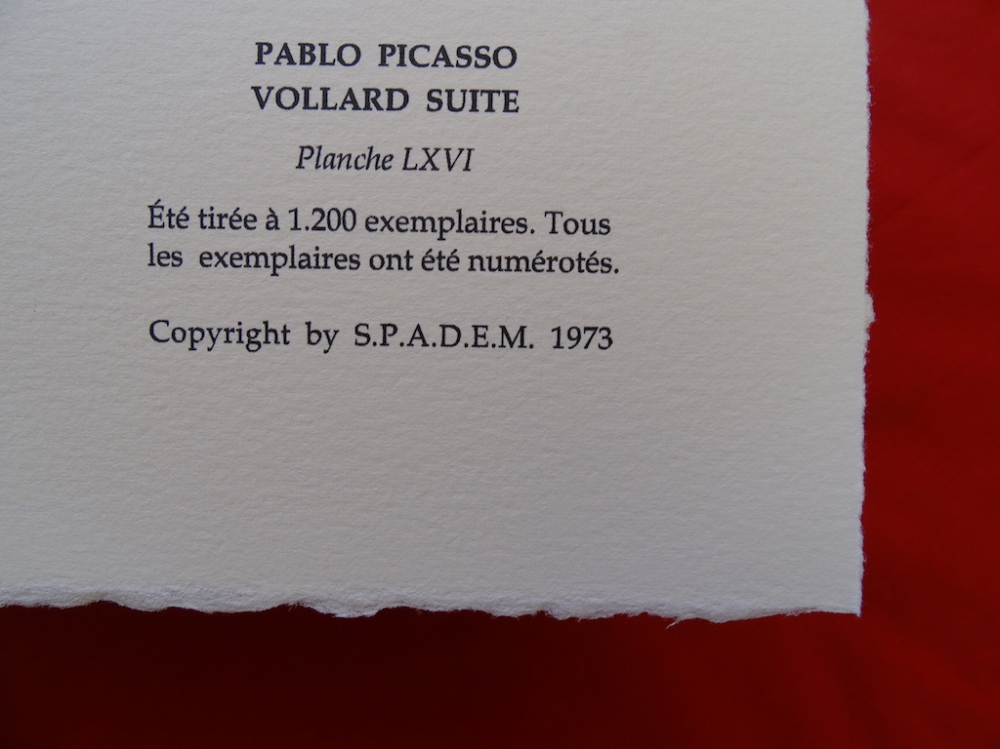 Pablo Picasso (1881-1973) The 100 original illustrations date from 1930 to 1937, the period in which Picasso drew the complete series, a commission from Vollard, the art dealer. Sheet size: 32 x 42 cm Size with mat: 40 x 50 cm Acid free, museum quality, ready to be framed. Hand-crafted hand-cut Arches paper. S.P.A.D.E.M., Paris, 1973. Published during Picasso's lifetime. Numbered in pencil, printed signature, head sign in the bottom left-hand corner. Tracked international parcel Sometimes, the artist draws a sign or figure on the edge of the lithography stone or plate to test the acids behavior. This sign is usually destroyed before printing, but sometimes this detail remains, not only on the test print but on the whole print series. The above mentioned sign is a typical case.