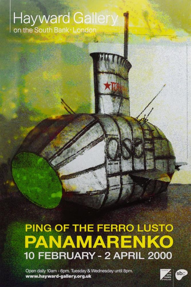 Affiche uit 2000 voor de "Ping of the Ferro Lusto"-expositie van Panamarenko in London in 2000.