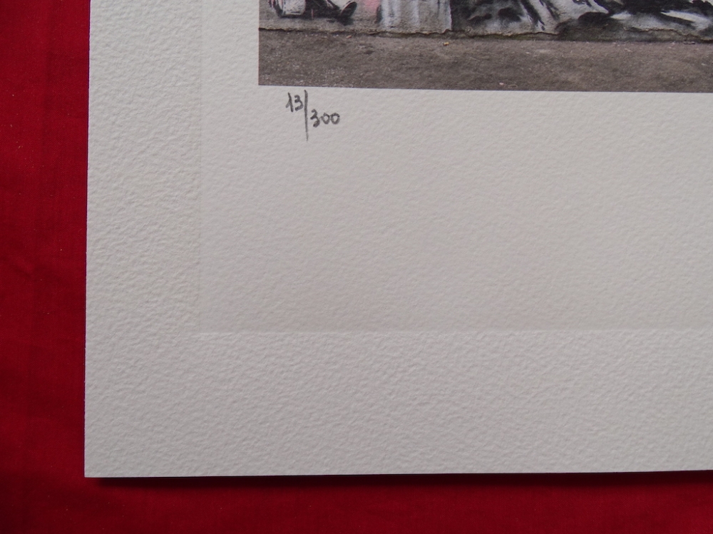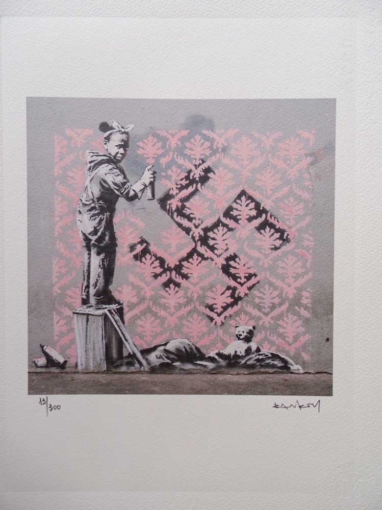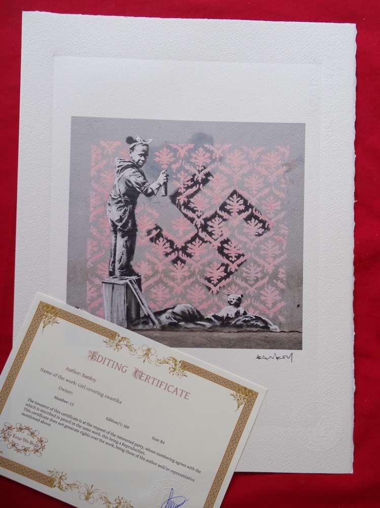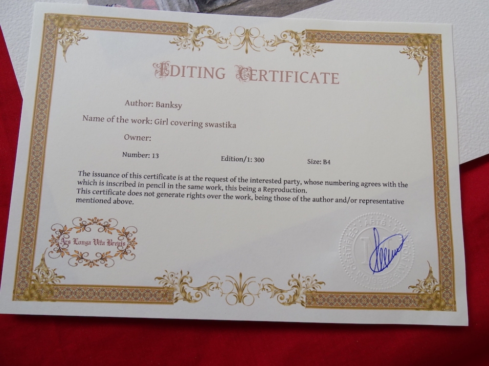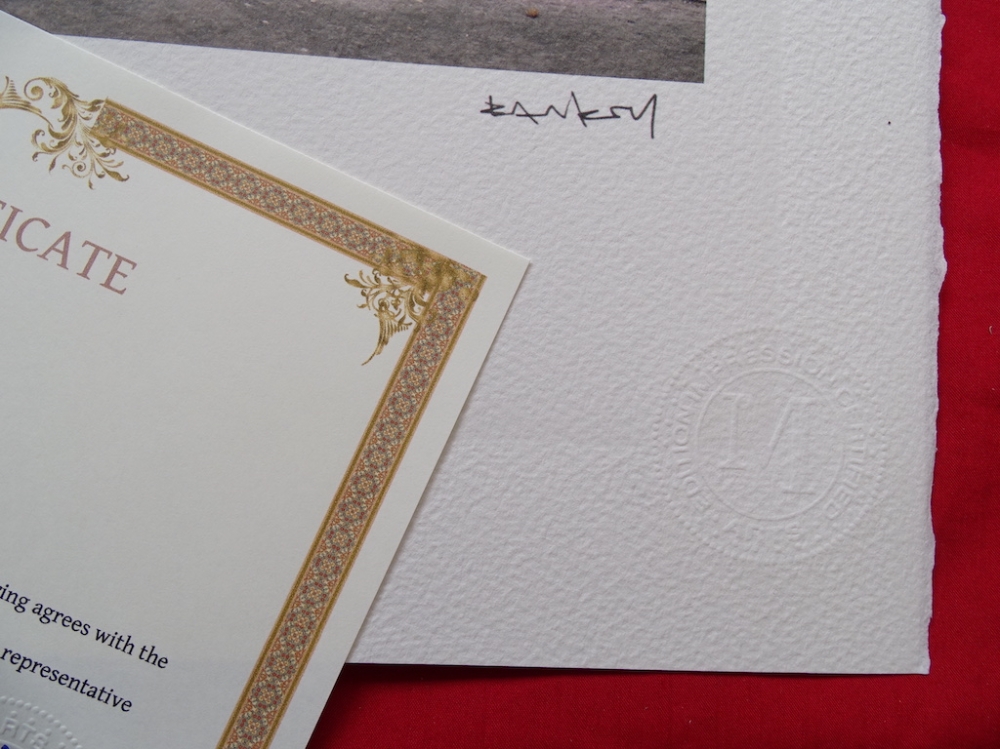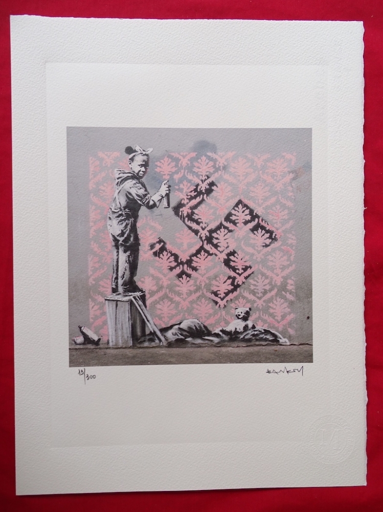 Banksy. Limited edition print reproduction, 38x28cm, Certificate of Authenticity by Certified Arts Edition Impression Ars Longa Vita Brevis Banksy is a pseudonymous England-based street artist, political activist and film director whose real name and identity remain unconfirmed and the subject of speculation. Active since the 1990s, his satirical street art and subversive epigrams combine dark humour with graffiti executed in a distinctive stenciling technique. His works of political and social commentary have appeared on streets, walls and bridges throughout the world. Banksy's work grew out of the Bristol underground scene, which involved collaborations between artists and musicians.Banksy says that he was inspired by 3D, a graffiti artist and founding member of the musical group Massive Attack. Banksy displays his art on publicly visible surfaces such as walls and self-built physical prop pieces. Banksy no longer sells photographs or reproductions of his street graffiti, but his public "installations" are regularly resold, often even by removing the wall they were painted on.Much of his work can be classified as temporary art. A small number of Banksy's works are officially, non-publicly, sold through an agency created by Banksy named Pest Control. Banksy's documentary film Exit Through the Gift Shop (2010) made its debut at the 2010 Sundance Film Festival.In January 2011, he was nominated for the Academy Award for Best Documentary Feature for the film. In 2014, he was awarded Person of the Year at the 2014 Webby Awards.