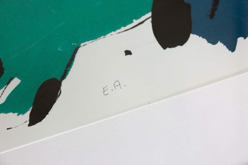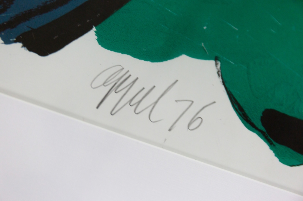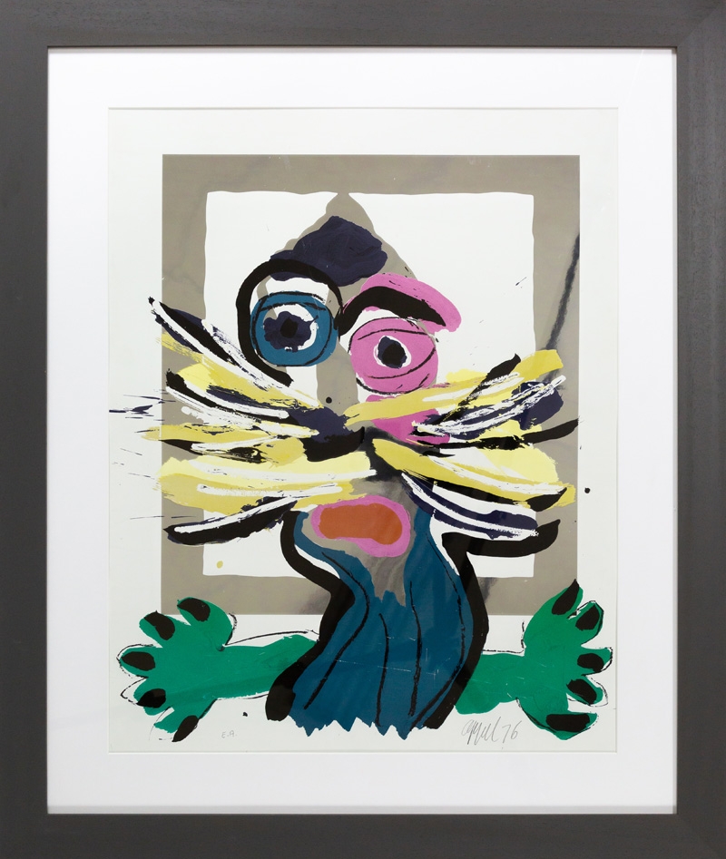 Een TOP zeefdruk van Karel Appel uit 1976. Uitzonderlijk is het gebruik van een spiegelende verf. De grijze band reflecteert daardoor. Het aangeboden exemplaar is een proefdruk gesigneerd als EA (Epreuve Artist)