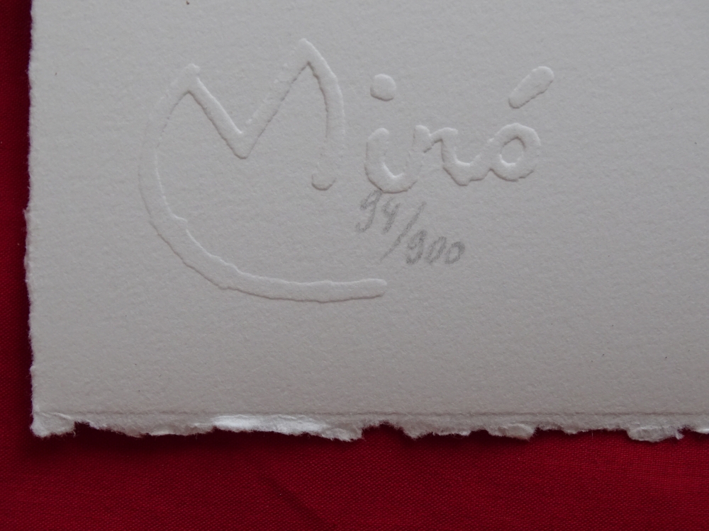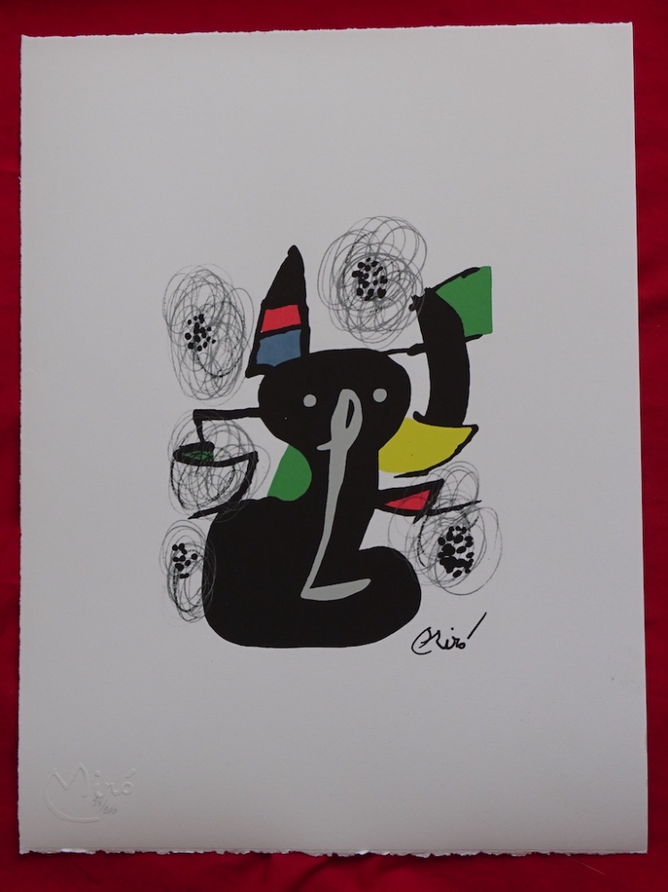 Lithografie door Joan Miro Handtekening in reliëf geautoriseerd door de kunstenaar. Met de hand gerechtvaardigd ongeveer 39x29cm - Conditie: uitstekend (dit kunstwerk is nooit ingelijst of weergegeven en wordt nog steeds bewaard in een professioneel kunstdossier, dus het wordt in onberispelijke staat bewaard). Joan Miró (1893-1983) werd geboren in Barcelona, waar hij opgroeide en zijn artistieke studies begon. Hij ging naar de La Llotja Academie tegen de wens van zijn ouders in, die wilden dat hij op een meer traditionele manier ging werken. Later studeerde hij aan de Escola d'Art de Francesc Galí en ontmoette hij de fauvisten en de kubisten. Zijn emotionele landschappen, die hem als persoon en kunstenaar zullen vormen, zijn in wezen Mont-roig, Parijs, Mallorca en later New York en Japan. Mont-roig, een kleine stad in de Baix Camp-regio, zal het contrapunt zijn van de intellectuele onrust die hem bewoont in Parijs, waar hij in de jaren 1920 evolueert met de surrealistische dichters en de meest creatieve kunstenaars van zijn tijd. Daar ontmoette hij Arp, Magritte, Brancusi en Giacometti en exposeerde hij met Dalí, Tanguy, Meret Oppenheim en Max Ernst in verschillende tentoonstellingen over dadaïsme en surrealisme. De stimulans voor het abstract expressionisme werd ontdekt in New York in de jaren 40. Later, in 1956, midden in de Tweede Wereldoorlog, verliet Joan Miró zijn ballingschap in Frankrijk en vestigde zich in Palma de Mallorca, een toevluchtsoord en werkplek, waar zijn vriend Josep Lluís Sert ontwerpt de werkplaats waar hij altijd van heeft gedroomd. Daar concentreerde hij zich tot aan zijn dood in 1983 op beeldhouwkunst en keramiek. Zijn wortels in eerst het landschap van Mont-roig en later dat van Mallorca zullen bepalend zijn in zijn werk. De link met het territorium en de interesse in alledaagse voorwerpen en de natuurlijke omgeving zullen de achtergrond vormen van enkele van zijn technische en formele onderzoeken.