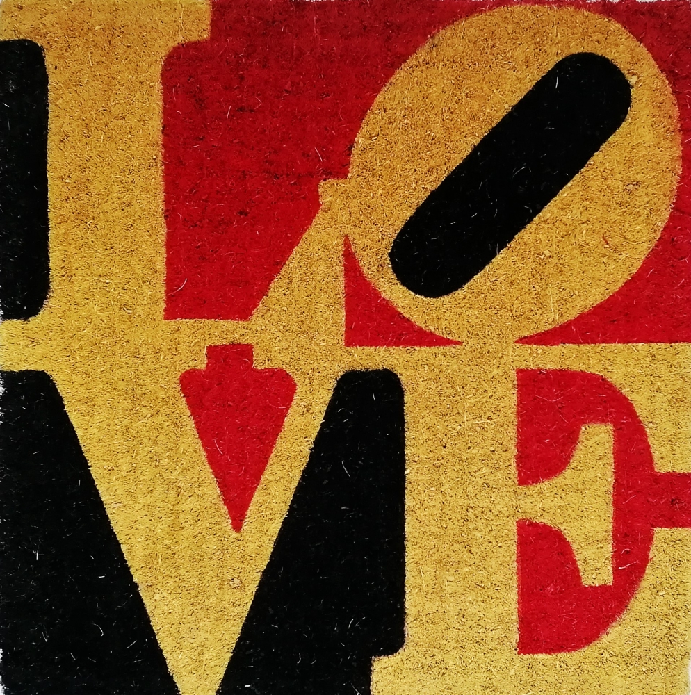 Robert INDIANA (1928-2018) BELGIAN LOVE, 2005 Originele en zeldzame multiple, op Kokosvezel. Dit betreft een zeldzaam multiple van 51 x 51 cm en 3 cm dik. (niet de wollen multiple! ) Gesigneerd verso in de steen door de kunstenaar op het certificaat.