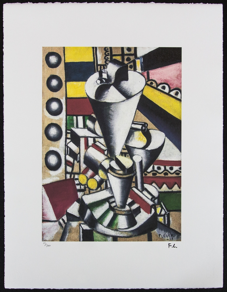 Fernand Léger (naar) lithografie "Still life in the elements of the machine", plaat gesigneerd rechtsonder, genummerd in potlood linksonder, gelimiteerde oplage 21/300, stempel van de uitgeverij rechtsonder links "Leonardo Artis", BFK Rives France dik papier met watermerk, bladformaat 50 x 65 cm, zonder aanvullende documentatie, wordt zonder lijst verkocht, wij bieden verzending aan huis, als de koper meerdere items wint, combineren we de verzending
