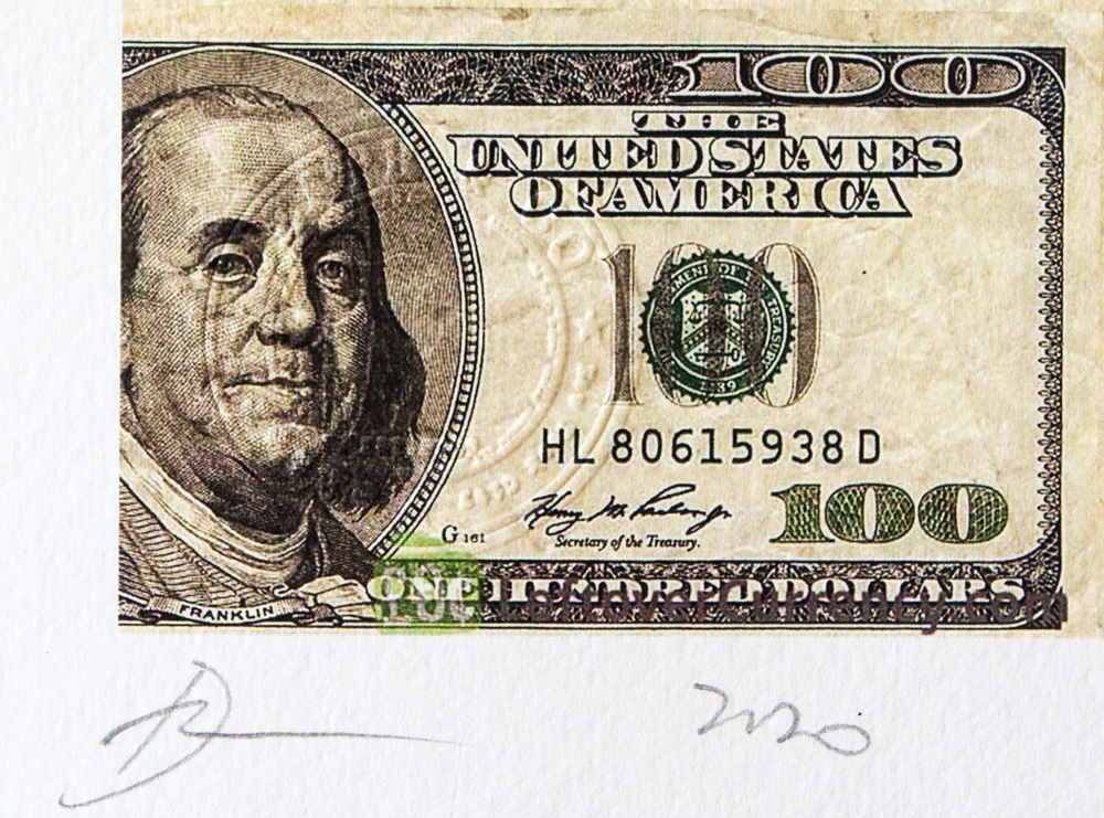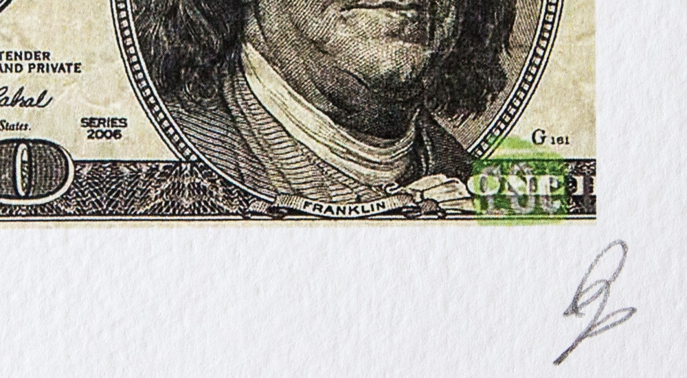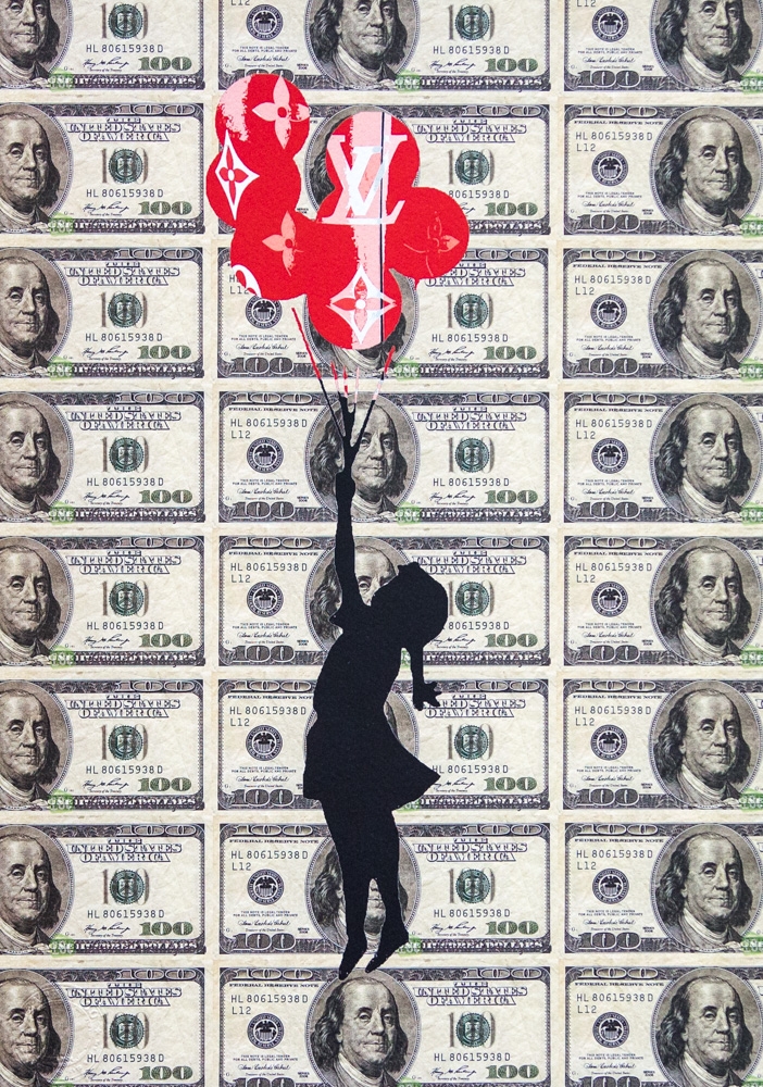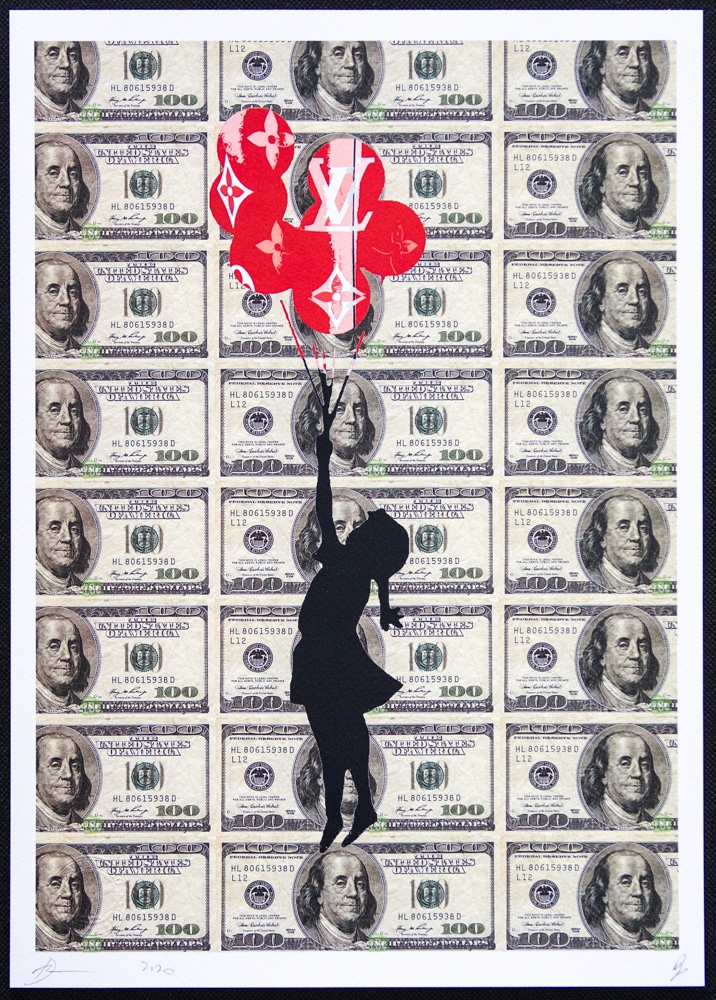 DEATH NYC "Banksy - Flying Balloon Girl & Louis Vuitton & Dollars" DEATH NYC is een straatartiest gevestigd in New York. Zijn pseudoniem is een acroniem voor "Don't Easy Abandon the Hope". Print is blind gestempeld, wordt geleverd met een ondertekend DEATH NYC Certificaat van Echtheid en Gold Seal-sticker, afmeting: 45 x 32 cm, met de hand gesigneerd, uitstekende staat, wordt niet ingelijst verkocht, wij bieden de in-house verzending aan, als de koper meerdere items wint, zullen we verzending combineren