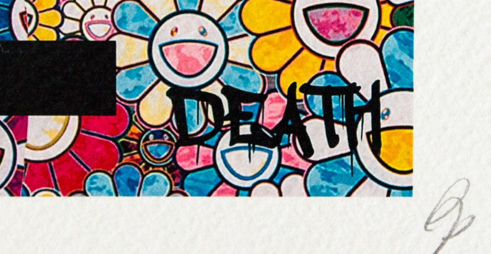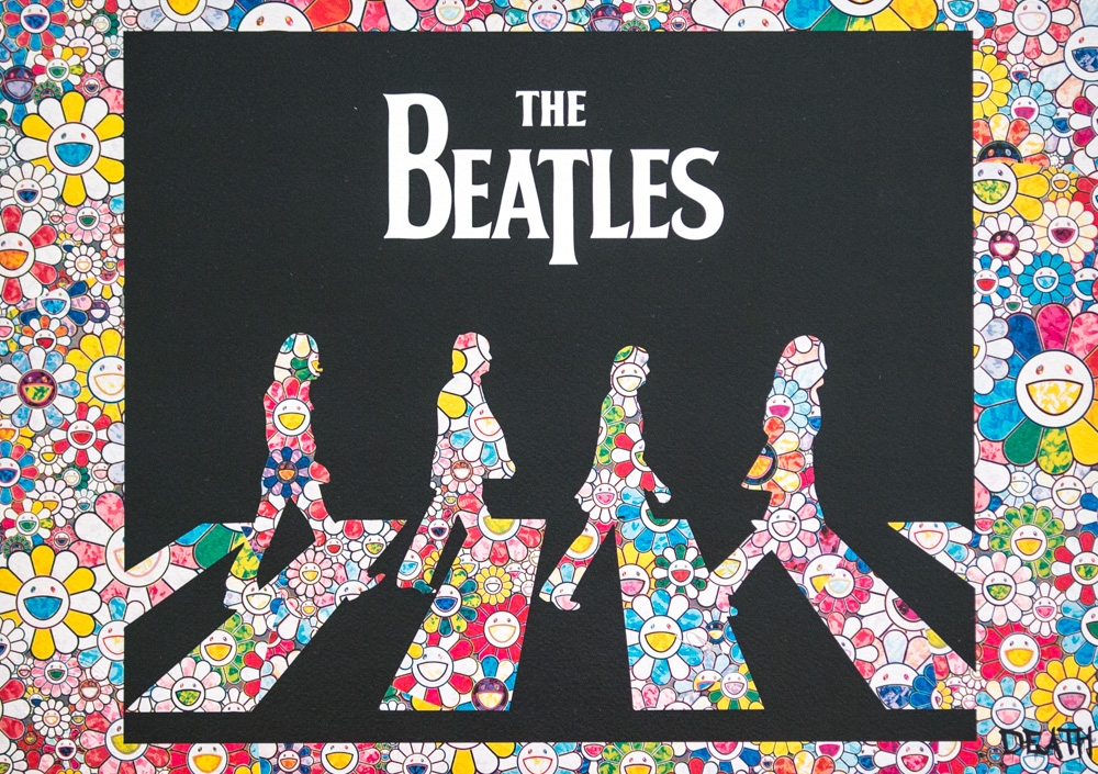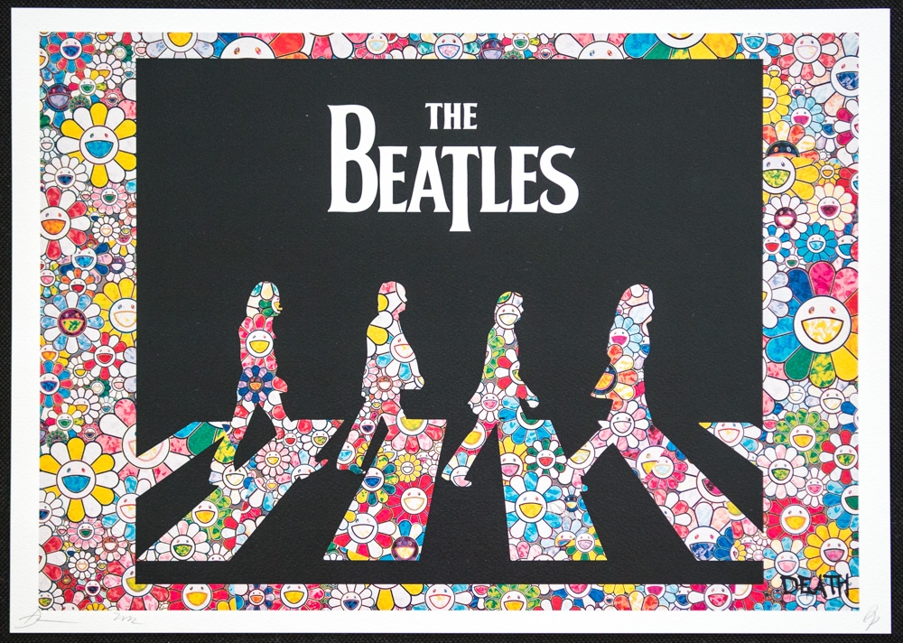 DEATH NYC "THE BEATLES & Murakami" DEATH NYC is een straatartiest gevestigd in New York. Zijn pseudoniem is een acroniem voor "Don't Easy Abandon the Hope". Print is blind gestempeld, wordt geleverd met een ondertekend DEATH NYC Certificaat van Echtheid en Gold Seal-sticker, afmeting: 45 x 32 cm, met de hand gesigneerd, uitstekende staat, wordt niet ingelijst verkocht, wij bieden de in-house verzending aan, als de koper meerdere items wint, zullen we verzending combineren