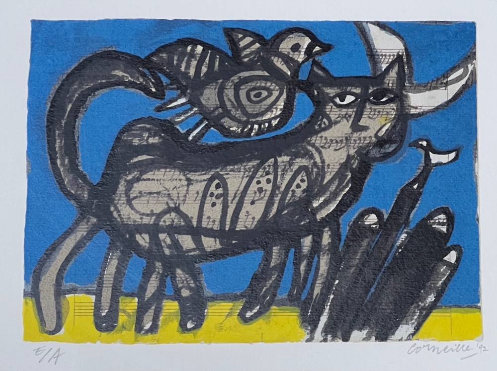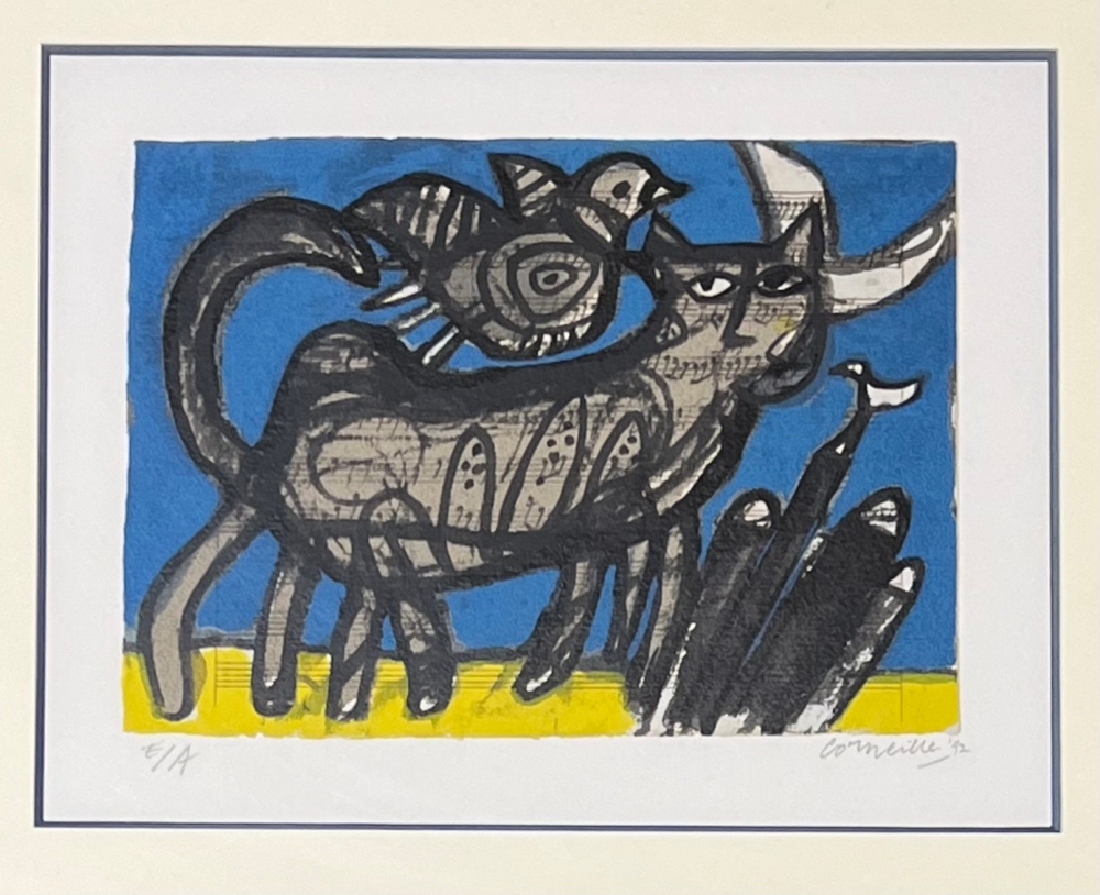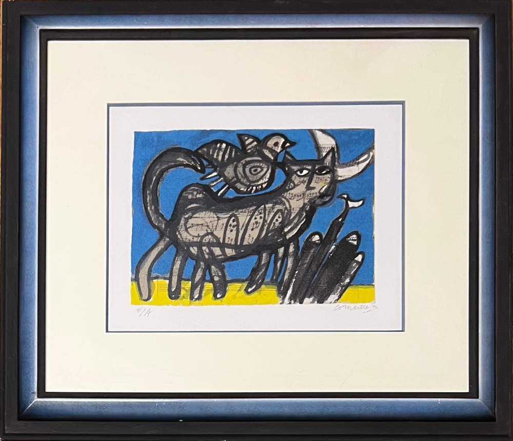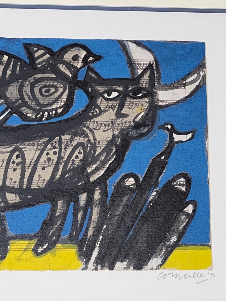 Eye of Cobra tentoonstelling in Miami met de grootste Amerikaanse collectie van Corneille in voorjaar en zomer 2023. Retrospectief van Corneille dat op 15 januari eindigde in het Cobra Museum in Amstelveen. Uitbrengen van een Cobra / Corneille postzegel bij Bpost in 2023 Corneille juwelen tentoongesteld bij de Boghossian Stichting tot 14 mei 2023 (Ornamentum, collectie Diane Venet) Prachtige originele ingelijste zeefdruk van de schilder Guillaume Corneille (1922-2010), geboren in Luik uit Nederlandse ouders, stichtend lid van de Cobra-beweging, met Karel Appel, Constant, Asger Jorn, Dotremont, Joseph Noiret of Lucebert of Alechinsky. Ingelijst tijdens het leven van de schilder. Massief hout gevernist en geschilderd zoals het is (met enkele oneffenheden en sporen van slijtage) met Atelier Corneille stempel op de achterkant. Totale afmetingen met lijst: 57 x 66 cm - 1992 - Let op: dit is ons ENIGE exemplaar! Gesigneerd en gedateerd in potlood door de kunstenaar - Kunstenaarsexemplaar E/A Guillaume Corneille was eregast op het Salzburgse muziekfestival en werkte enkele jaren aan het thema klassieke muziek (op de klanken van zijn favoriete componisten: Mozart, Tsjaikovski, Gustav Malher, Erik Satie, enz). Net als Pierre Alechinsky maakte hij veel werken op muziekpartituren. Zeer goede staat - Veilige levering in BIG BOX met verzekering door UPS Guillaume Corneille, grootmeester van de kleuren in het spoor van Gauguin en Matisse, creëert een joviale wereld vol exotisme.