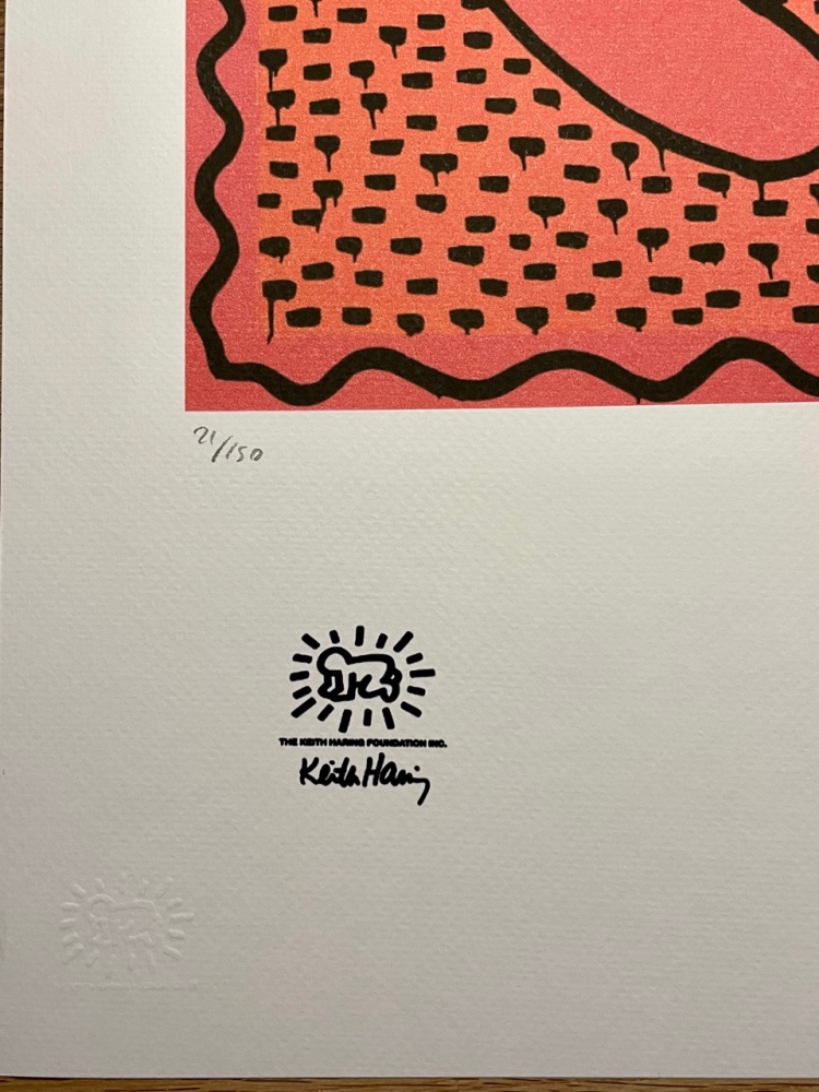 Lithografie "Zonder titel" Plaat met de hand gesigneerd en genummerd Gelimiteerde oplage van 150 stuks Elk stuk is individueel genummerd #21/150 Totale afmetingen: 50 cm x 70 cm Droogstempel Keith Haring Foundation