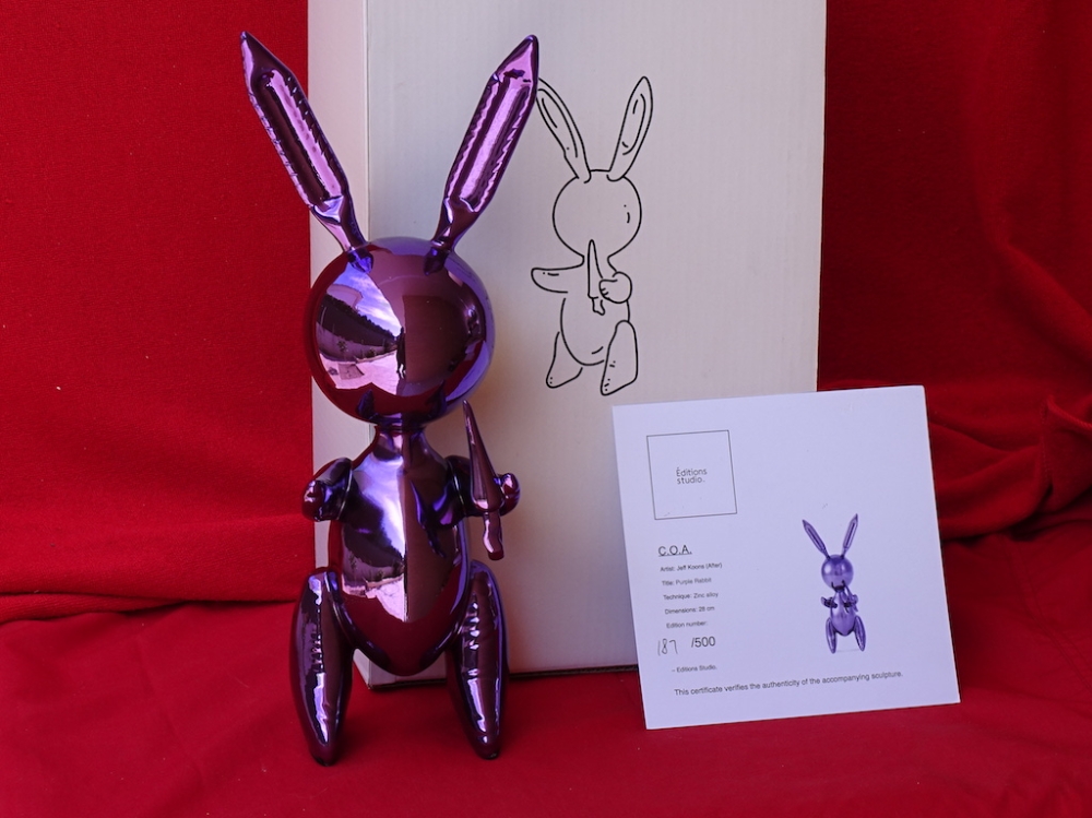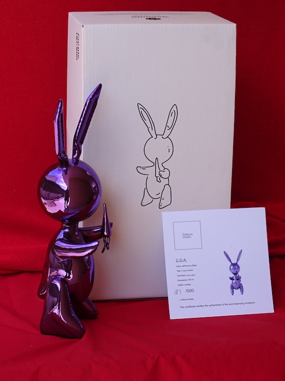 Jeff Koons (after)"Rabbit" Limited edition Zinc alloy 28 cm. About 2 kg. Edition of 500 Studio Editions, complete with original box and original protective packaging. Numbered with certificate. COA Take home this beautiful sculpture by Jeff Koons! Add to your collection with a pice by the undisputed master of neo pop art! Jeffrey Koons, simply known as Jeff Koons, is an American artist considered an icon of the neo-pop style. Jeff Koons Artist is known for his works in kitsch style that ironically illustrate the American way of life and its tendency to consumerism. Today Jeff Koons is considered one of the richest artists in the world and an icon of neo-pop style. During his career, Koons has produced artworks using a vast range of techniques - such as sculpture, painting, installations and photo - and the most varied materials. The artist is generally defined as heir of Andy Warhol and continuator of the pop art; he is often also associate to Marcel Duchamp, of which Koons reinterprets the technique of the ready-made.