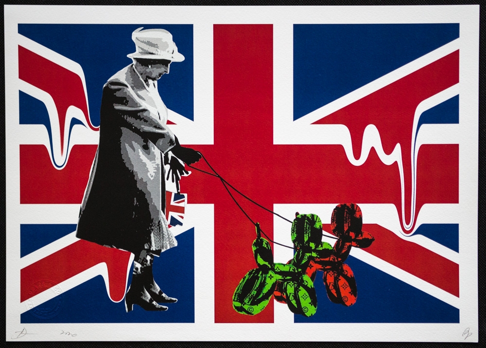 DEATH NYC "Queen Elizabeth & Jeff Koons" DEATH NYC is a New York City-based street artist. Her pseudonym is an acronym for "Don't Easily Abandon the Hope". Print is blind stamped, comes with Certificate of Authenticity signed DEATH NYC and Gold Seal Sticker, Size: 45 x 32 cm, Hand Signed, Excellent Condition, Sold Unframed, we offer in-house shipping, if the buyer win multiple items, we will combine shipping