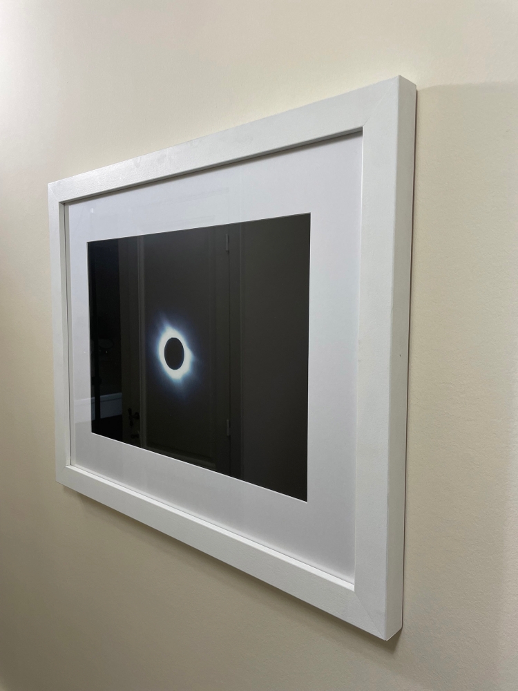 Ingekaderde fotolitho van zonne eclips van de hand van Ann Veronica Janssens uit 2013. Dit werk is gemaakt in een reeks van 4 en ze worden alle vier afzonderlijk aangeboden. Het werk is handgenummerd door de kunstenaar (zie foto). Ann Veronica Janssens (B, 1956) is een internationale beeldhouwer van het licht, van het geluid en van de ruimte. Ann Veronica Janssens gaat bijna altijd op minimale wijze te werk zonder echt bij de minimal art te horen. Dat haar werk echter wel eens met de minimalistische stroming in verband wordt gebracht komt door de heldere vormgeving en de materiaalkeuze: transparant, glanzend of juist verdicht en schijnbaar ontoegankelijk. De kunstenaar woont en werkt in Brussel. De foto komt uit de reeks 'Museum to scale' uitgegeven door gallerist Ronny Van de Velde. Het geheel wordt vakkundig ingepakt en opgestuurd.
